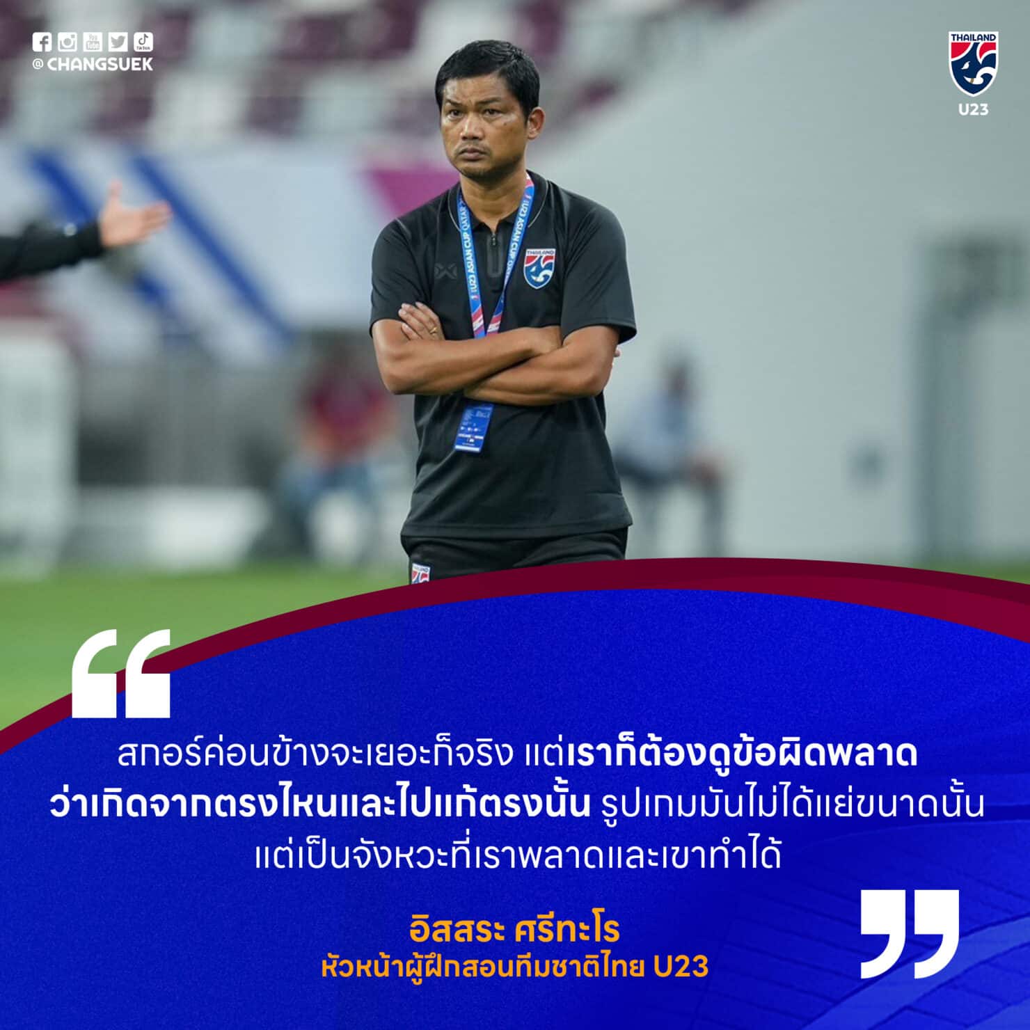 หลังจบเกมการแข่งขัน อิสสระ ศรีทะโร หัวหน้าผู้ฝึกสอนทีมชาติไทย U23 กล่าวว่า “อย่างแรกเลยก็ต้องชื่มชมทางซาอุฯ เขาเป็นทีมที่มีความแข็งแกร่งจริงๆ เราเป็นรองในหลายๆอย่าง รวมถึงข้อผิดพลาดที่เกิดขึ้นของทีมเราด้วย ก็ต้องไปแก้ไขกันต่อ อย่างไรขอชื่นชมน้องๆที่สู้ตลอดทั้งเกม ถึงแม้ผลสกอร์จะโดนนำห่างไปเรื่อยๆ แต่ทุกคนไม่ยอมแพ้ เสียดายที่เกมนี้เราทำประตูไม่ได้ หลังจากนี้ต้องกลับไปฟื้นฟูสภาพร่างกายและโฟกัสต่อไป”