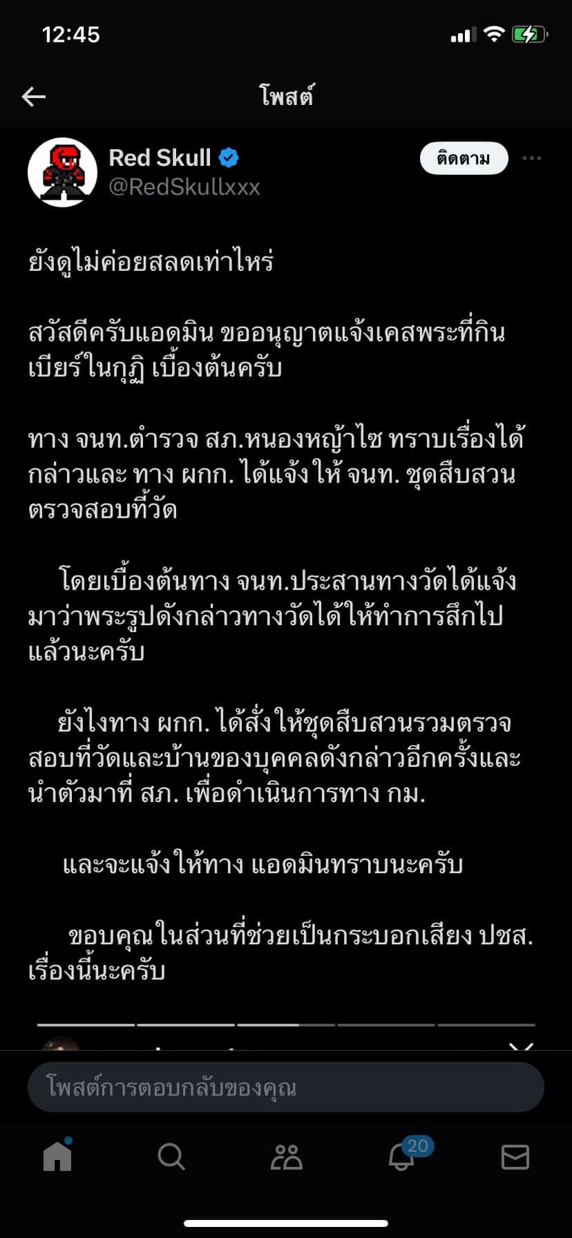 สวัสดีครับแอดมิน ขออนุญาตแจ้งเคสพระที่กิน เบียร์ในกุฏิ เบื้องต้นครับ ทาง จนท.ตํารวจ สภ.หนองหญ้าไซ ทราบเรื่องได้ กล่าวและ ทาง ผกก. ได้แจ้งให้ จนท. ชุดสืบสวน ตรวจสอบที่วัด
