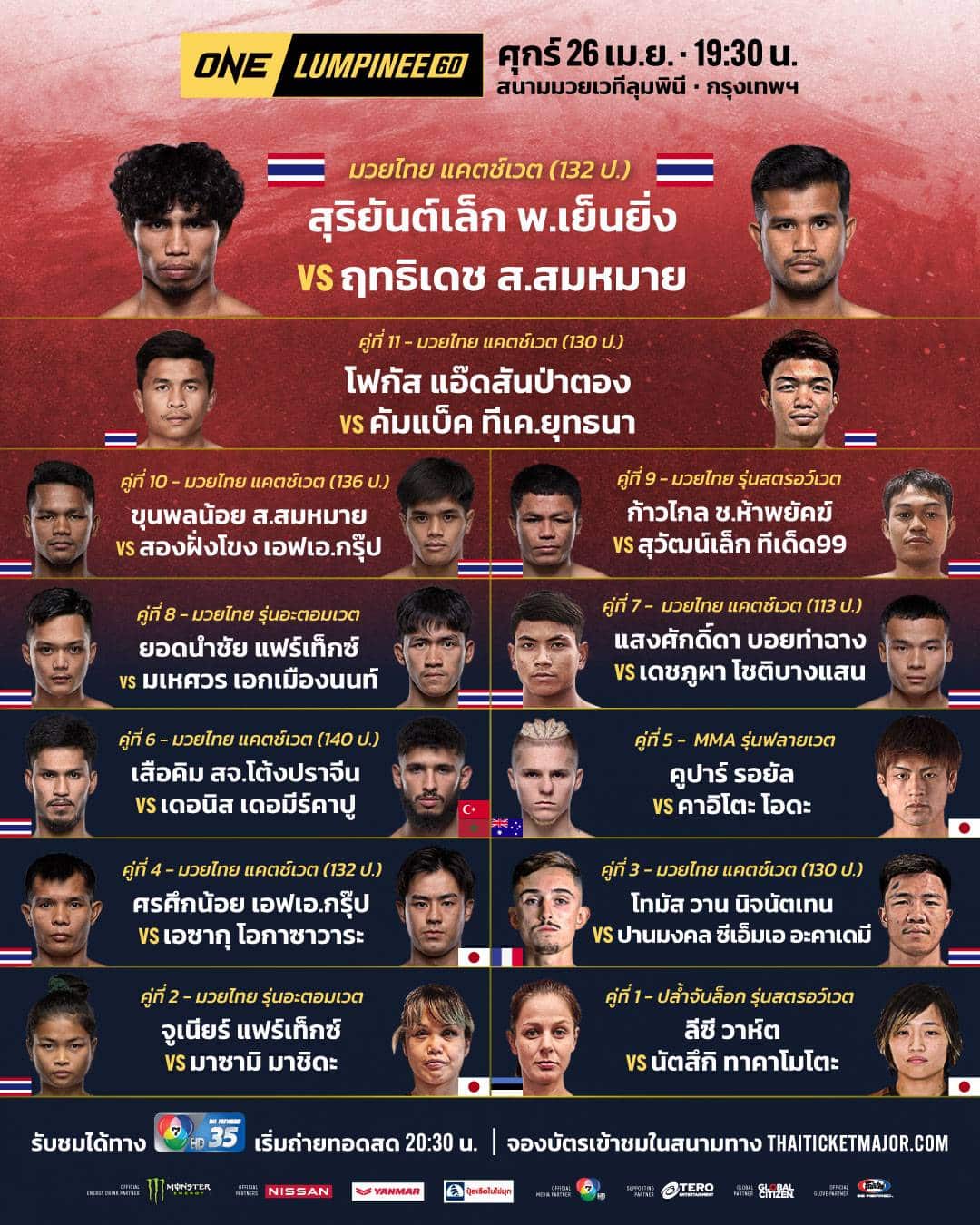 โปรแกรมการแข่งขันทุกคู่ศึก ONE ลุมพินี 60