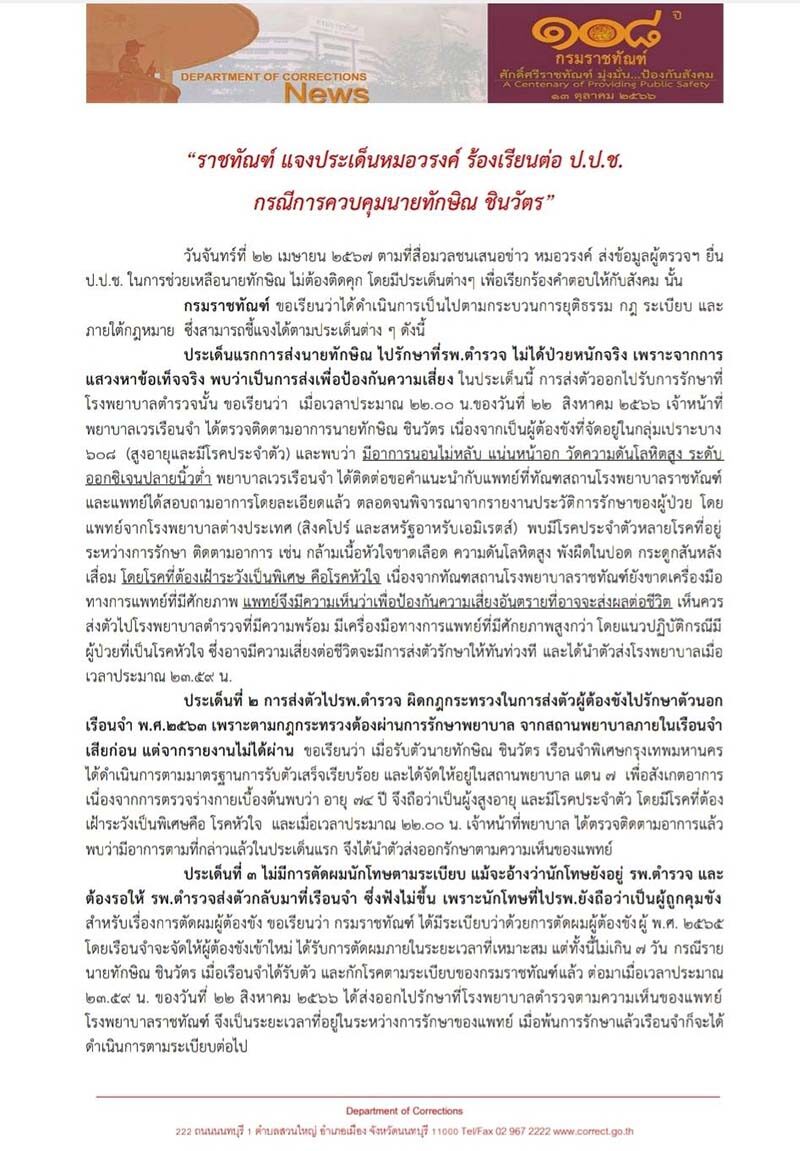 กรมราชทัณฑ์ ออกเอกสารชี้แจง จากกรณีที่ หมอวรงค์ เดชกิจวิกรม ประธานพรรคไทยภักดี ร้องเรียนต่อ ป.ป.ช. กรณีการควบคุมนายทักษิณ ชินวัตร อดีตนายกรัฐมนตรี ว่า ตามที่สื่อมวลชนเสนอข่าว หมอวรงค์ ส่งข้อมูลผู้ตรวจฯ ยื่น ป.ป.ช. ในการช่วยเหลือนายทักษิณ ไม่ต้องติดคุก โดยมีประเด็นต่างๆ เพื่อเรียกร้องคำตอบให้กับสังคม นั้น