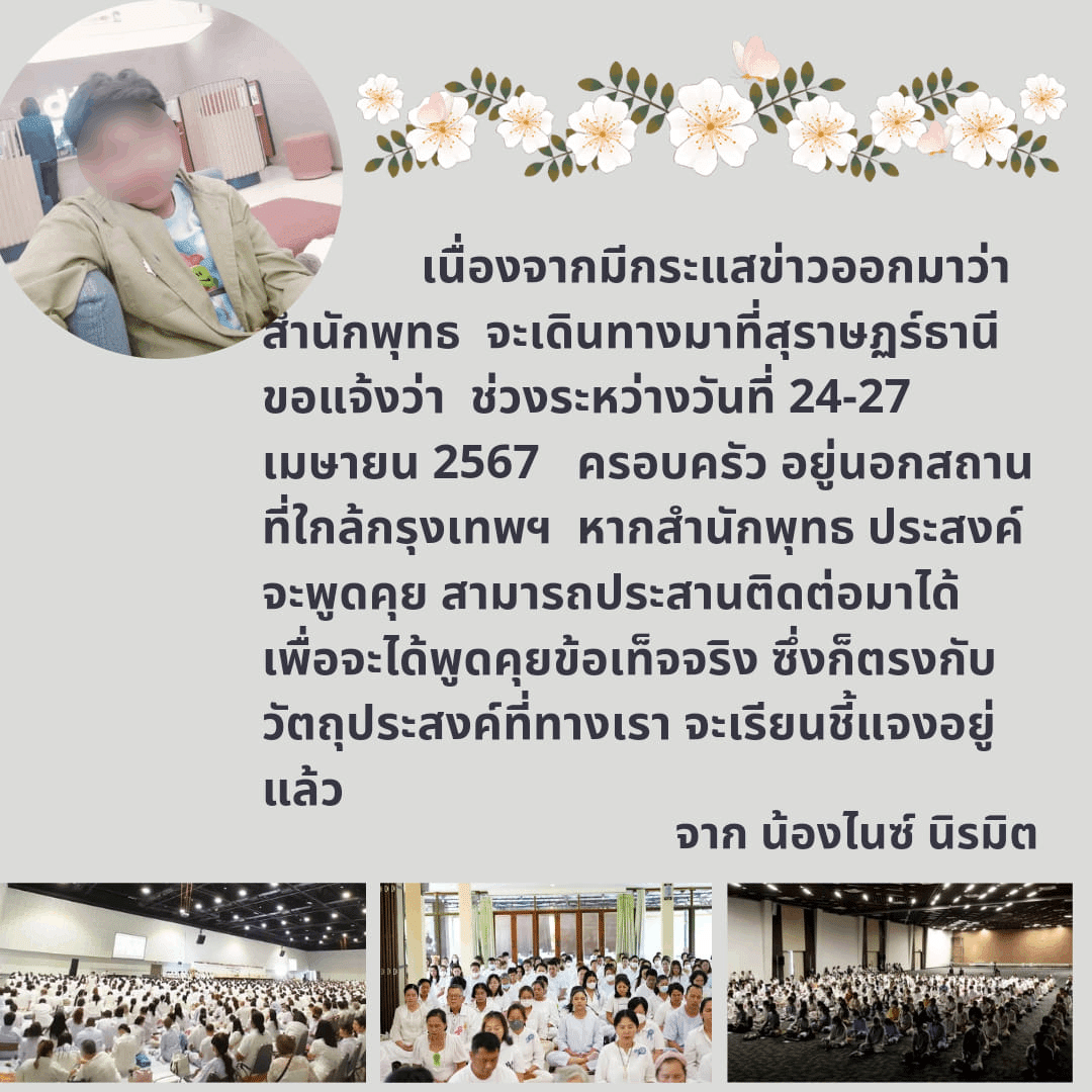 ขณะที่ นิรมิตเทวาจุติ โพสต์ข้อความเฟซบุ๊ก ระบุข้อความว่าเนื่องจากมีกระแสข่าวออกมาว่าสำนักพุทธ จะเดินทางมาที่สุราษฏร์ธานี ขอแจ้งว่า ช่วงระหว่างวันที่ 24-27 เมษายน 2567 อยู่นอกสถานที่ใกล้กรุงเทพฯ หากสำนักพุทธ ประสงค์จะพูดคุย สามารถประสานติดต่อมาได้ เพื่อจะได้พูดคุยข้อเท็จจริง ซึ่งก็ตรงกับวัตถุประสงค์ ที่ทางเราจะเรียนชี้แจงอยู่แล้ว