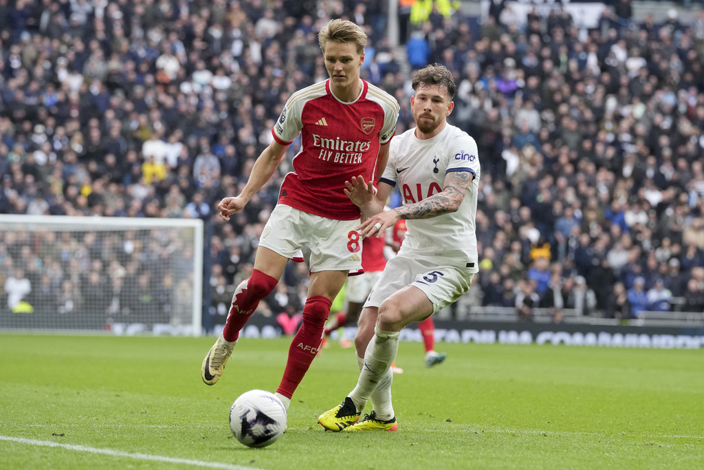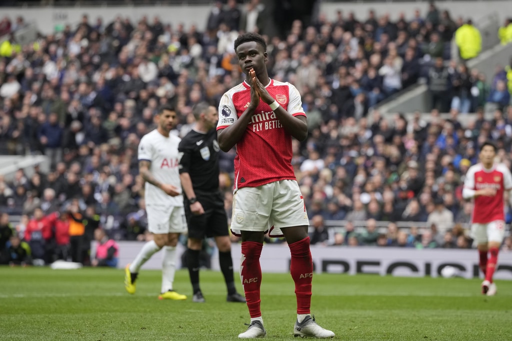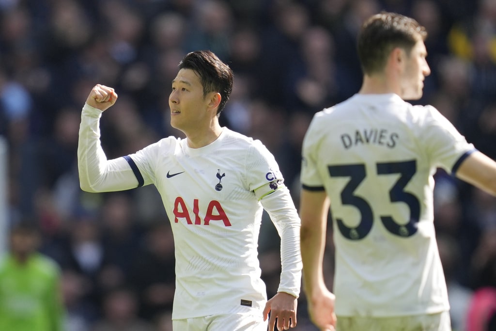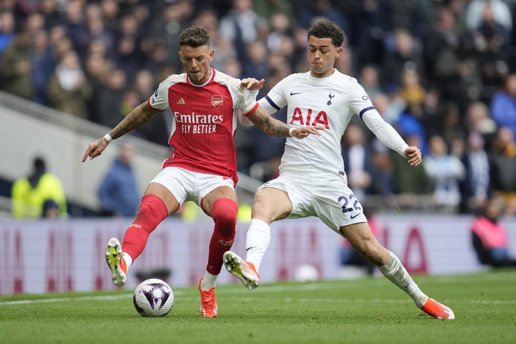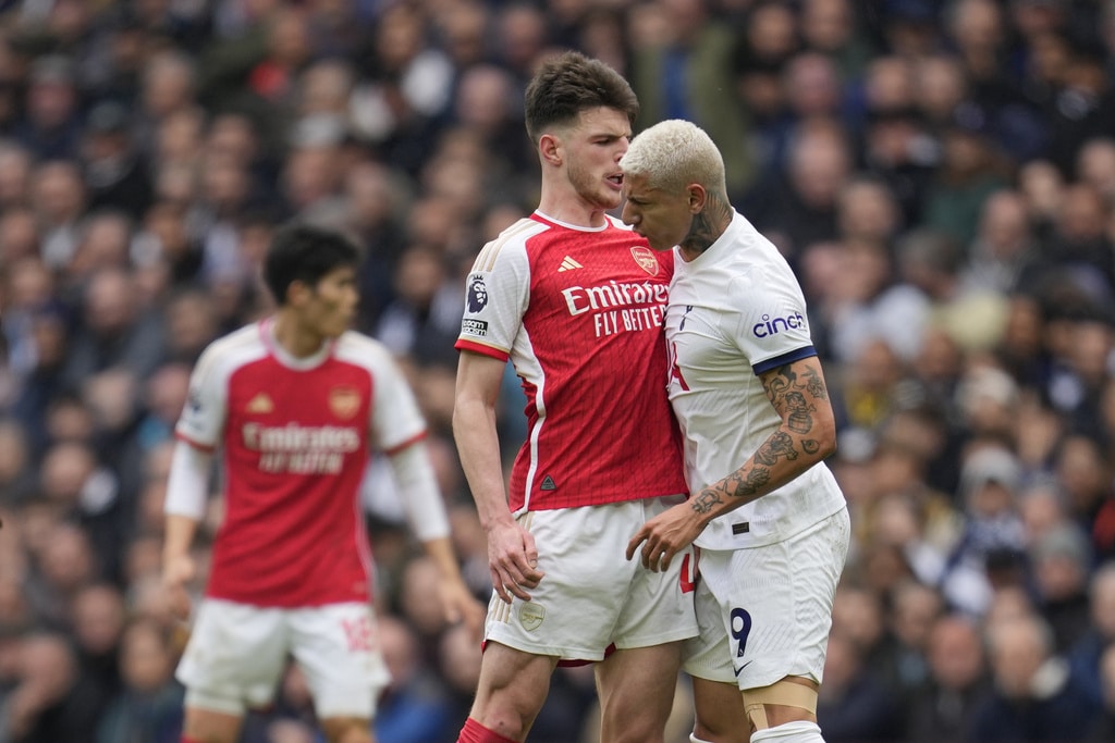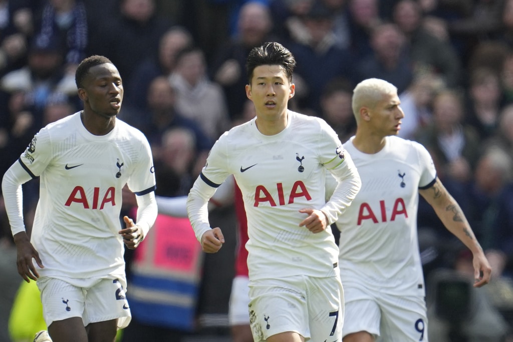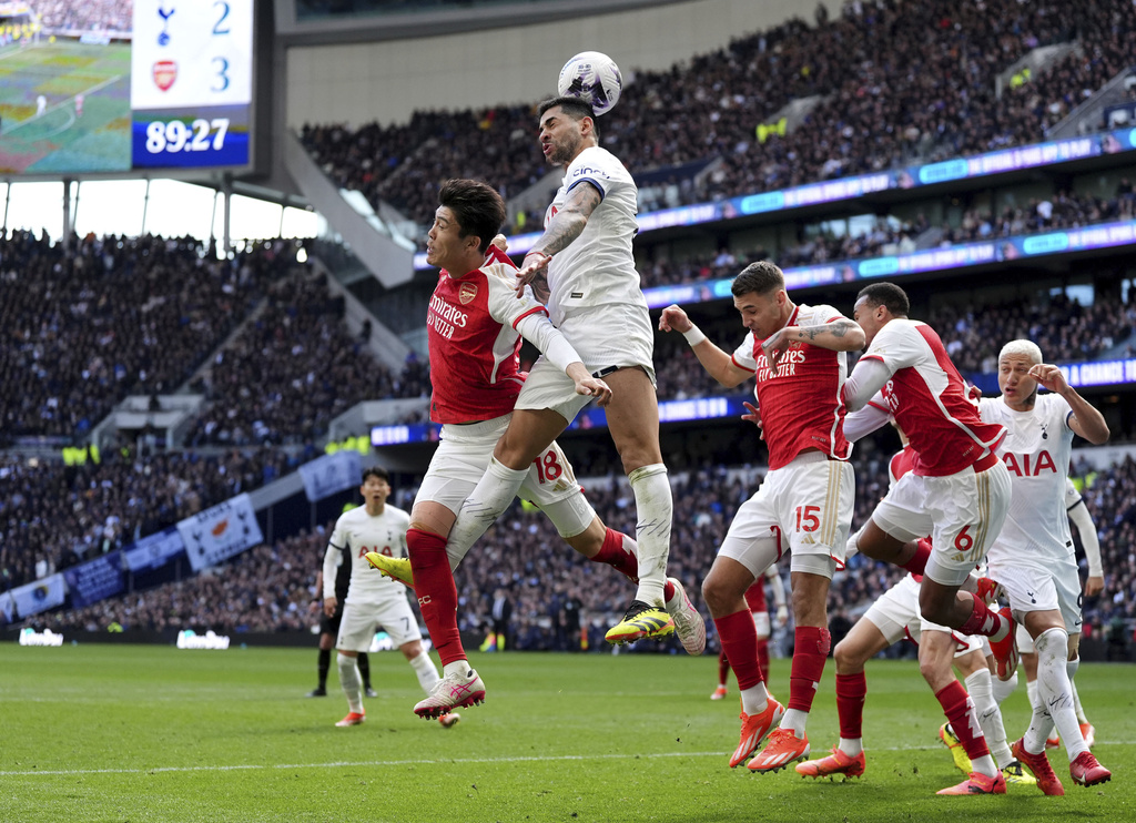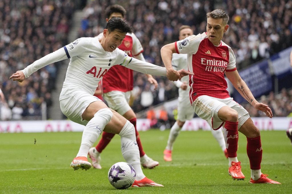 Arsenal’s Leandro Trossard, right, challenges for the ball with Tottenham’s Son Heung-min during the English Premier League soccer match between Tottenham Hotspur and Arsenal at the Tottenham Hotspur Stadium in London, England, Sunday, April 28, 2024. (AP Photo/Kin Cheung)Arsenal’s Takehiro Tomiyasu, left, and Tottenham Hotspur’s Cristian Romero battle for the ball during the English Premier League soccer match between Tottenham Hotspur and Arsenal at the Tottenham Hotspur Stadium, London, Sunday April 28, 2024. (Zac Goodwin/PA via AP)Tottenham’s Son Heung-min celebrates after scoring his side’s second goal from a penalty shot during the English Premier League soccer match between Tottenham Hotspur and Arsenal at the Tottenham Hotspur Stadium in London, England, Sunday, April 28, 2024. (AP Photo/Kin Cheung)Tottenham’s Son Heung-min celebrates after scoring his side’s second goal from a penalty shot during the English Premier League soccer match between Tottenham Hotspur and Arsenal at the Tottenham Hotspur Stadium in London, England, Sunday, April 28, 2024. (AP Photo/Kin Cheung)Arsenal’s Martin Odegaard, left, challenges for the ball with Tottenham’s Pierre-Emile Hojbjerg during the English Premier League soccer match between Tottenham Hotspur and Arsenal at the Tottenham Hotspur Stadium in London, England, Sunday, April 28, 2024. (AP Photo/Kin Cheung)Arsenal’s Bukayo Saka reacts after missing an opportunity to score during the English Premier League soccer match between Tottenham Hotspur and Arsenal at the Tottenham Hotspur Stadium in London, England, Sunday, April 28, 2024. (AP Photo/Kin Cheung)Tottenham’s Cristian Romero celebrates after scoring his side’s first goal during the English Premier League soccer match between Tottenham Hotspur and Arsenal at the Tottenham Hotspur Stadium in London, England, Sunday, April 28, 2024. (AP Photo/Kin Cheung)Arsenal’s Ben White, left, challenges for the ball with Tottenham’s Brennan Johnson during the English Premier League soccer match between Tottenham Hotspur and Arsenal at the Tottenham Hotspur Stadium in London, England, Sunday, April 28, 2024. (AP Photo/Kin Cheung)Tottenham’s Richarlison argues with Arsenal’s Declan Rice during the English Premier League soccer match between Tottenham Hotspur and Arsenal at the Tottenham Hotspur Stadium in London, England, Sunday, April 28, 2024. (AP Photo/Kin Cheung)