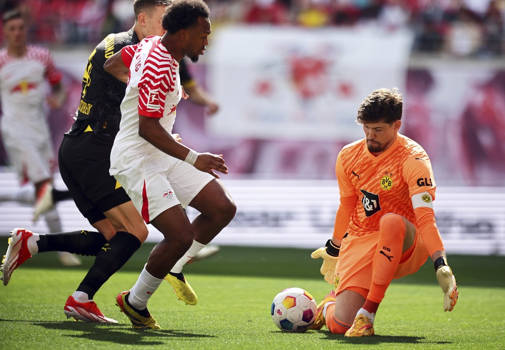 Leipzig’s Lois Openda, second left, in action against Dortmund’s goalkeeper Gregor Kobel, right, during the German Bundesliga soccer match between RB Leipzig and Borussia Dortmund in Leipzig, Germany, Saturday, April 27, 2024. (Jan Woitas/dpa via AP)Jan Woitas/dpa via AP)From left, Dortmund’s players Marco Reus, Felix Nmecha, Gregor Kobel and Youssoufa Moukoko applaud after the German Bundesliga soccer match between RB Leipzig and Borussia Dortmund in Leipzig, Germany, Saturday, April 27, 2024. (Jan Woitas/dpa via AP)Dortmund’s Nico Schlotterbeck, right, reacts next to teammate Marco Reus, left, during the German Bundesliga soccer match between RB Leipzig and Borussia Dortmund in Leipzig, Germany, Saturday, April 27, 2024. (Jan Woitas/dpa via AP)Leipzig’s Lois Openda, right, celebrates with teammate Castello Lukeba, left, after scoring the opening goal during the German Bundesliga soccer match between RB Leipzig and Borussia Dortmund in Leipzig, Germany, Saturday, April 27, 2024. (Jan Woitas/dpa via AP)Dortmund’s Nico Schlotterbeck, bottom, and Leipzig’s Lois Openda, top, challenge for the ball during the German Bundesliga soccer match between RB Leipzig and Borussia Dortmund in Leipzig, Germany, Saturday, April 27, 2024. (Jan Woitas/dpa via AP)Dortmund’s Mats Hummels, left, and Leipzig’s Lois Openda, right, challenge for the ball during the German Bundesliga soccer match between RB Leipzig and Borussia Dortmund in Leipzig, Germany, Saturday, April 27, 2024. (Jan Woitas/dpa via AP)Leipzig’s Xaver Schlager, left, and Dortmund’s Julian Ryerson, right, challenge for the ball during the German Bundesliga soccer match between RB Leipzig and Borussia Dortmund in Leipzig, Germany, Saturday, April 27, 2024. (Jan Woitas/dpa via AP)Leipzig’s Willi Orban, left, and Dortmund’s Julian Brandt, right, challenge for the ball during the German Bundesliga soccer match between RB Leipzig and Borussia Dortmund in Leipzig, Germany, Saturday, April 27, 2024. (Jan Woitas/dpa via AP)