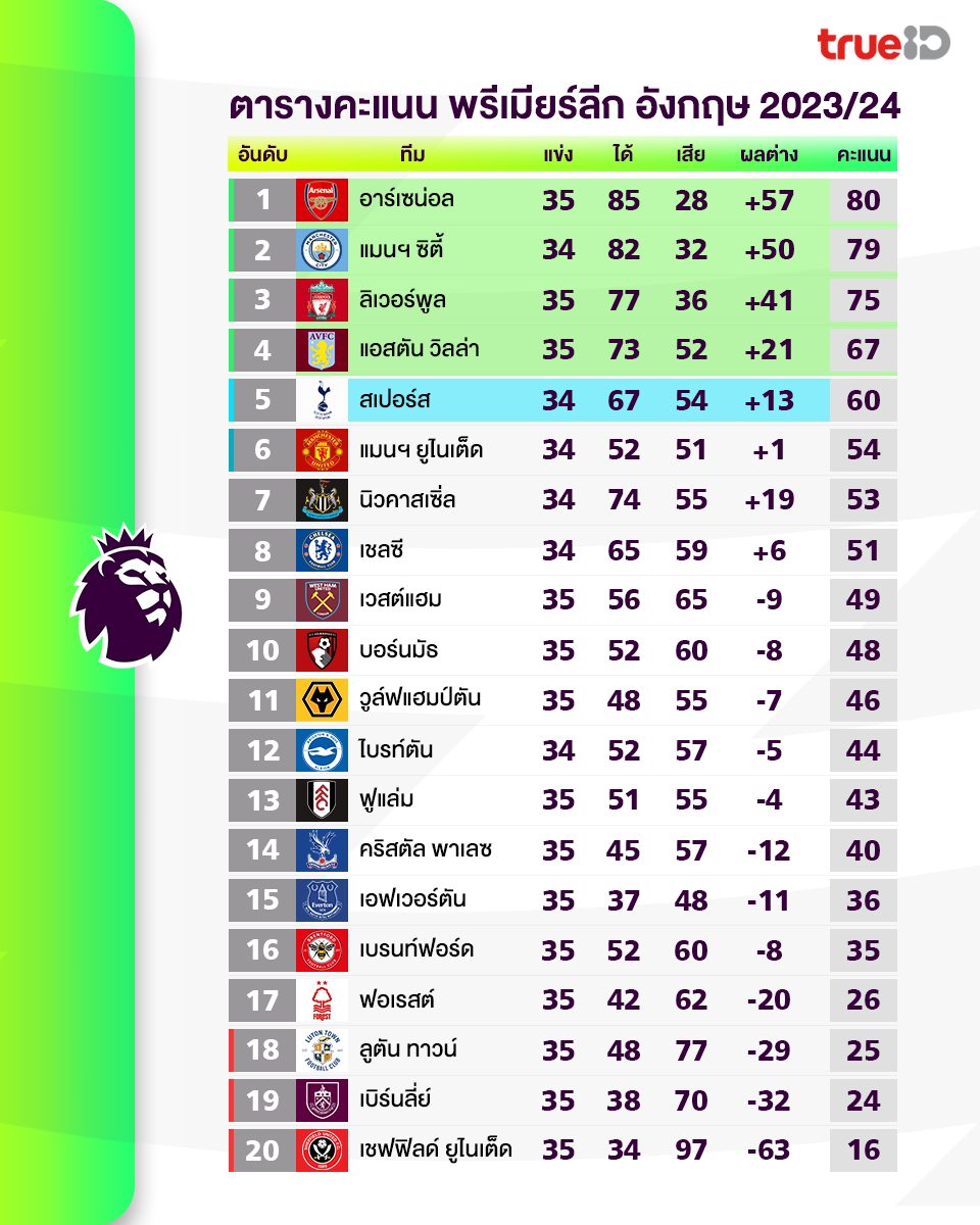 สรุปผลการแข่งขัน พรีเมียร์ลีก อังกฤษ 2023/24 หลังจบนัดที่ 35