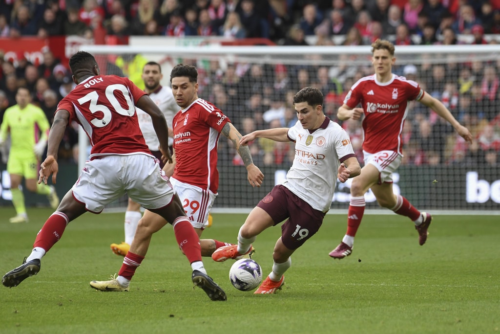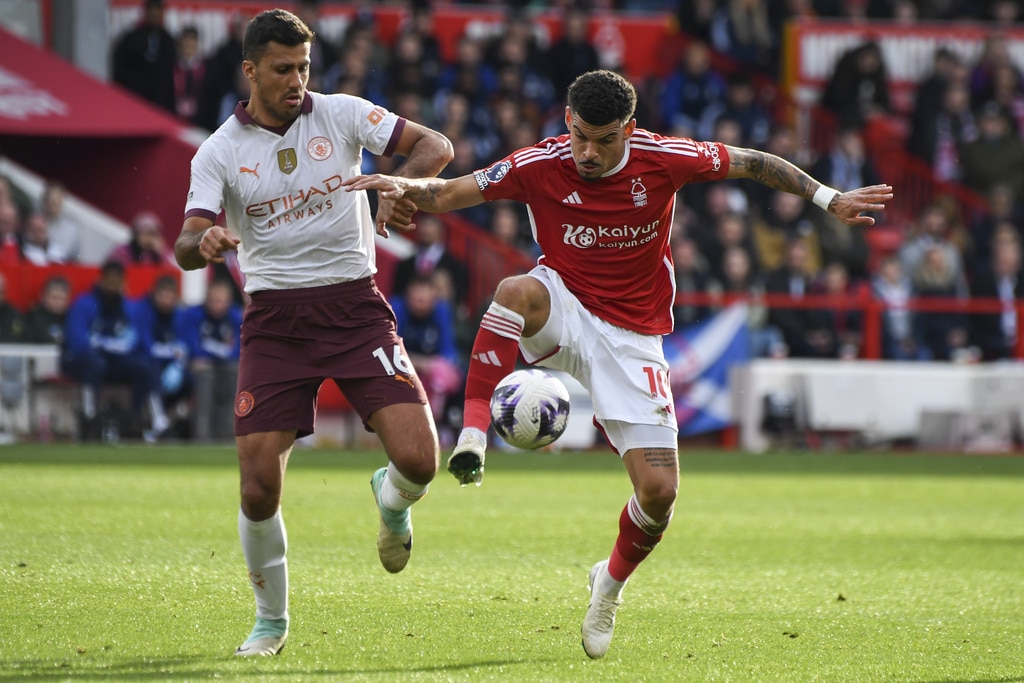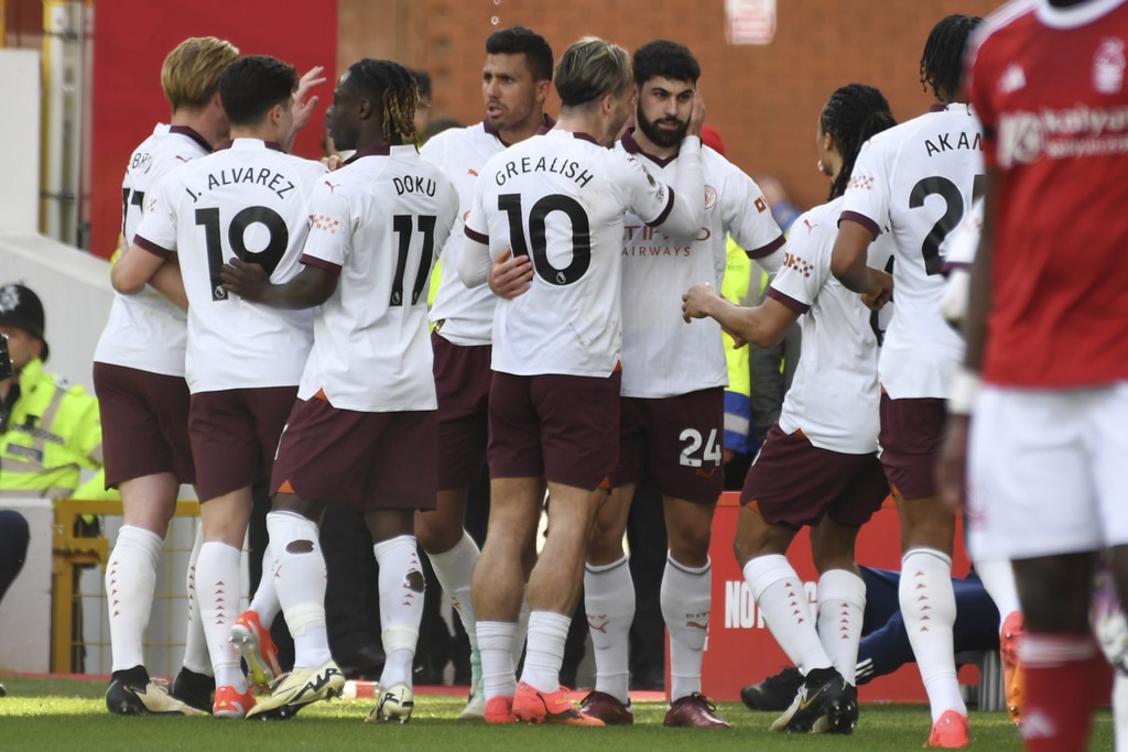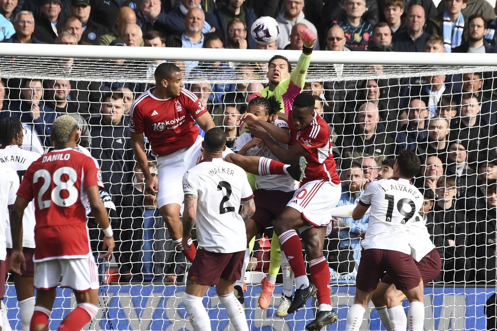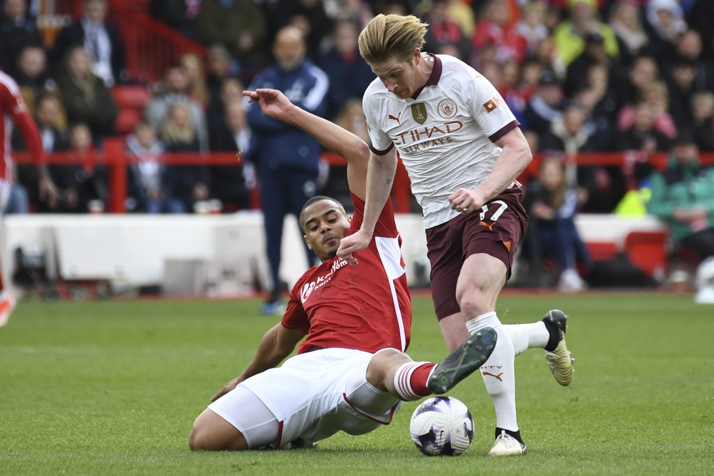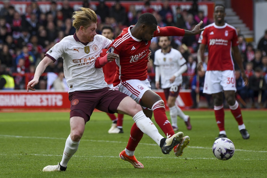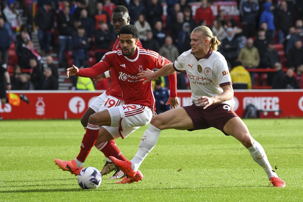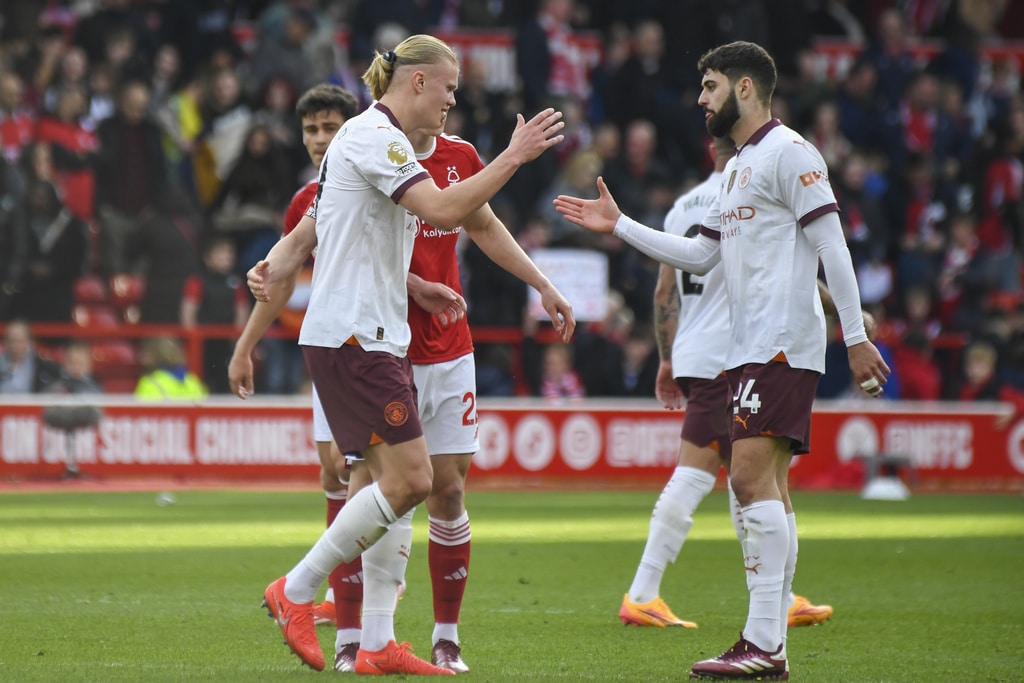 Manchester City’s goalkeeper Ederson, top, rejects the ball during the English Premier League soccer match between Nottingham Forest and Manchester City at the City Ground stadium in Nottingham, England, Sunday, April 28, 2024. (AP Photo/Rui Vieira)Manchester City’s Erling Haaland, left, and Josko Gvardiol shake hands at the end of the English Premier League soccer match between Nottingham Forest and Manchester City at the City Ground stadium in Nottingham, England, Sunday, April 28, 2024. Manchester City won 2-0. (AP Photo/Rui Vieira)Nottingham Forest’s Andrew Omobamidele, left, and Manchester City’s Erling Haaland vie for the ball during the English Premier League soccer match between Nottingham Forest and Manchester City at the City Ground stadium in Nottingham, England, Sunday, April 28, 2024. (AP Photo/Rui Vieira)Nottingham Forest’s Morgan Gibbs-White, right, controls the ball challenged by Manchester City’s Rodrigo during the English Premier League soccer match between Nottingham Forest and Manchester City at the City Ground stadium in Nottingham, England, Sunday, April 28, 2024. (AP Photo/Rui Vieira)Manchester City’s Julian Alvarez, center, dribbles the ball past Nottingham Forest’s Willy Boly, left, and Gonzalo Montiel during the English Premier League soccer match between Nottingham Forest and Manchester City at the City Ground stadium in Nottingham, England, Sunday, April 28, 2024. (AP Photo/Rui Vieira)Manchester City’s Erling Haaland, center, celebrates scoring his side’s 2nd goal past teammate Julian Alvarez during the English Premier League soccer match between Nottingham Forest and Manchester City at the City Ground stadium in Nottingham, England, Sunday, April 28, 2024. (AP Photo/Rui Vieira)Nottingham Forest’s Murillo, left, challenges Manchester City’s Kevin De Bruyne during the English Premier League soccer match between Nottingham Forest and Manchester City at the City Ground stadium in Nottingham, England, Sunday, April 28, 2024. (AP Photo/Rui Vieira)Manchester City’s Manuel Akanji kicks the ball during the English Premier League soccer match between Nottingham Forest and Manchester City at the City Ground stadium in Nottingham, England, Sunday, April 28, 2024. (AP Photo/Rui Vieira)Manchester City’s Kevin De Bruyne, left, and Nottingham Forest’s Callum Hudson-Odoi vie for the ball during the English Premier League soccer match between Nottingham Forest and Manchester City at the City Ground stadium in Nottingham, England, Sunday, April 28, 2024. (AP Photo/Rui Vieira)