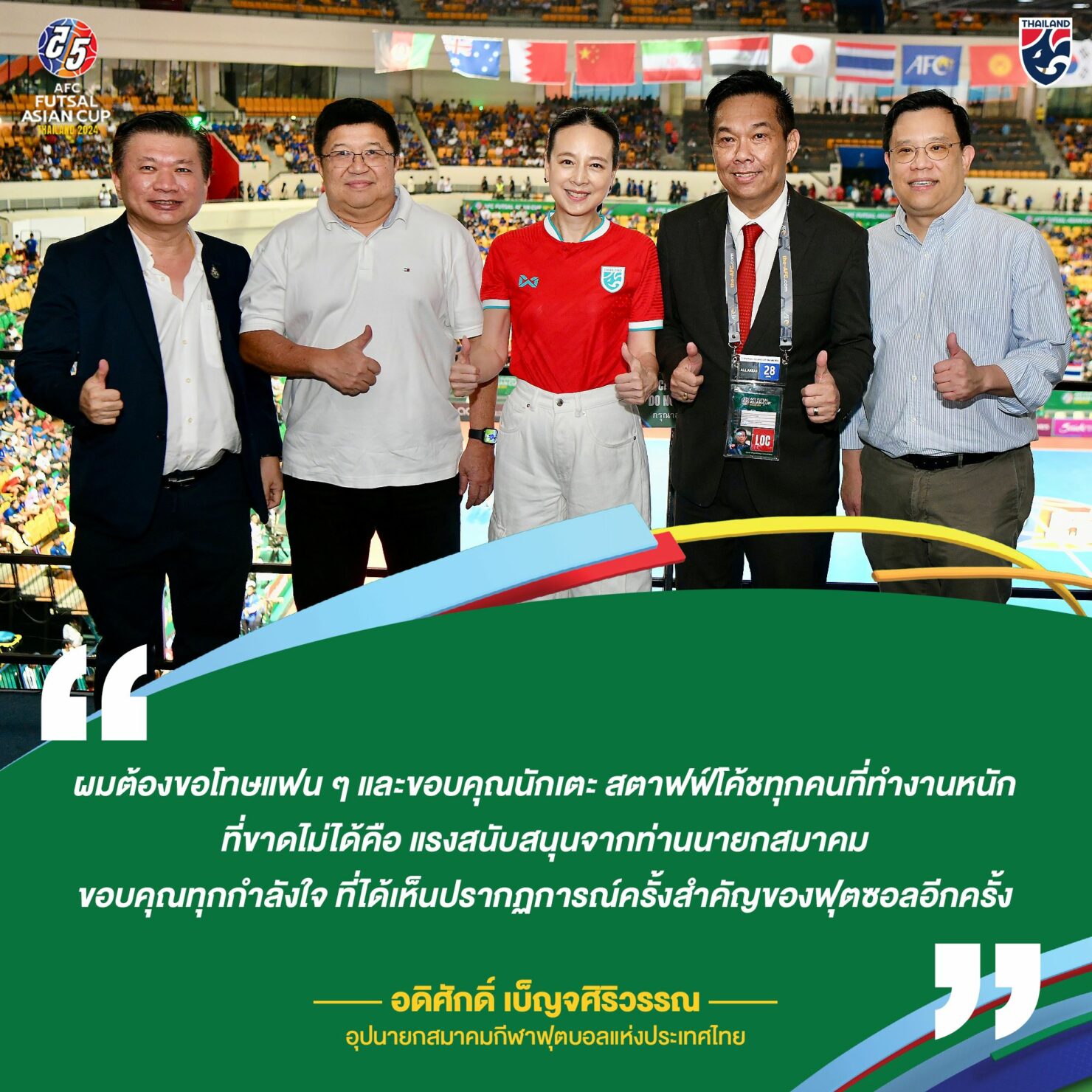 “เราฝ่าฟันเกมที่ยากพลิกวิกฤตกลับมาได้หลายแมตช์ตผมภาคภูมิใจเเละขอบคุณนักเตะสตาฟฟ์โค้ชทุกคนที่ทุ่มเททำงานหนักกันอย่างเต็มที่ และที่ขาดไม่ได้คือแรงสนับสนุนจากท่านนายกสมาคมกีฬาฟุตบอล คุณนวลพรรณ ล่ำซำ วันนี้ก็เดินทางมาส่งกำลังใจที่สนามด้วย ขอบคุณทุกกำลังใจแฟนฟุตซอลทั่วประเทศทั้งในสนามและรับชมผ่านช่องทีสอร์ต ได้เห็นปรากฏการณ์ครั้งสำคัญของฟุตซอลอีกครั้งในการเป็นเจ้าภาพ และความสามารถของทีมชาติในระดับเอเชีย”