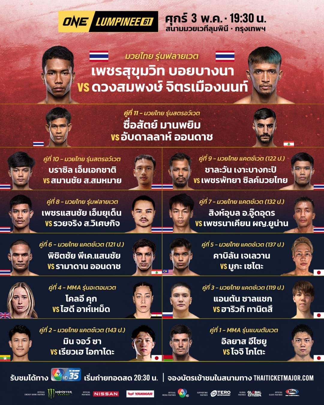 โปรแกรมการแข่งขันทุกคู่ศึก ONE ลุมพินี 61