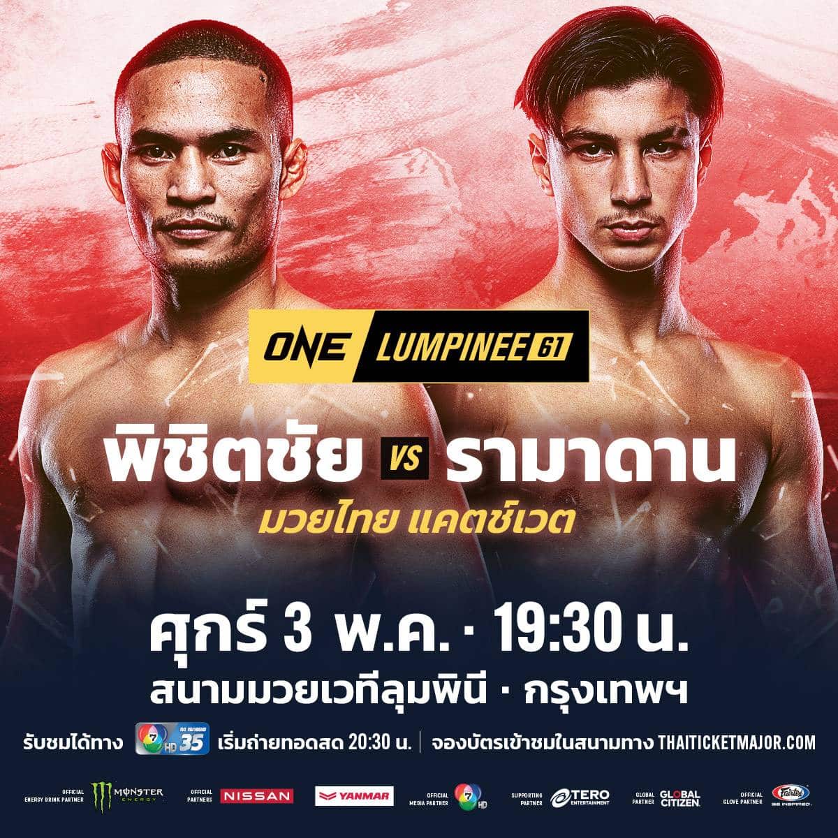 สานต่อความมันเป็นประจำทุกสัปดาห์ กับรายการแข่งขันศิลปะการต่อสู้เรตติงยืนหนึ่งของประเทศไทย กับศึก ONE ลุมพินี 61 พร้อมออกอากาศสดสู่สายตาผู้ชมมากกว่า 190 ประเทศ โดยมีคู่มวยเดือด ให้รับชมกันทั้งสิ้น 12 คู่ พร้อมสู้กันอย่างสมศักดิ์ศรีบนเวทีลุมพินี (รามอินทรา) ในวันศุกร์ที่ 3 พ.ค.นี้