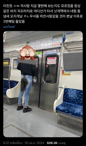ขมคอคนใช้บริการรถไฟเกาหลีใต้ เมื่อมีผู้ใช้ทวิตเตอร์รายหนึ่ง ได้โพสต์ภาพชวนอ้วก ประสบการณ์นั่งรถไฟฟ้าในเมืองปูซานสุดสยอง เมื่อเธอต้องร่วมขบวนกับชายคนหนึ่ง คาดว่าเป็นคนไร้บ้าน ใส่กางเกงยีนส์ที่มีคราบเหลืองและน้ำเลอะราดเต็มกางเกง เดาจากกลิ่นเหม็นคละคลุ้งแล้วต้องเป็นอุจจาระกับปัสสาวะอย่างไม่มีข้อสงสัย