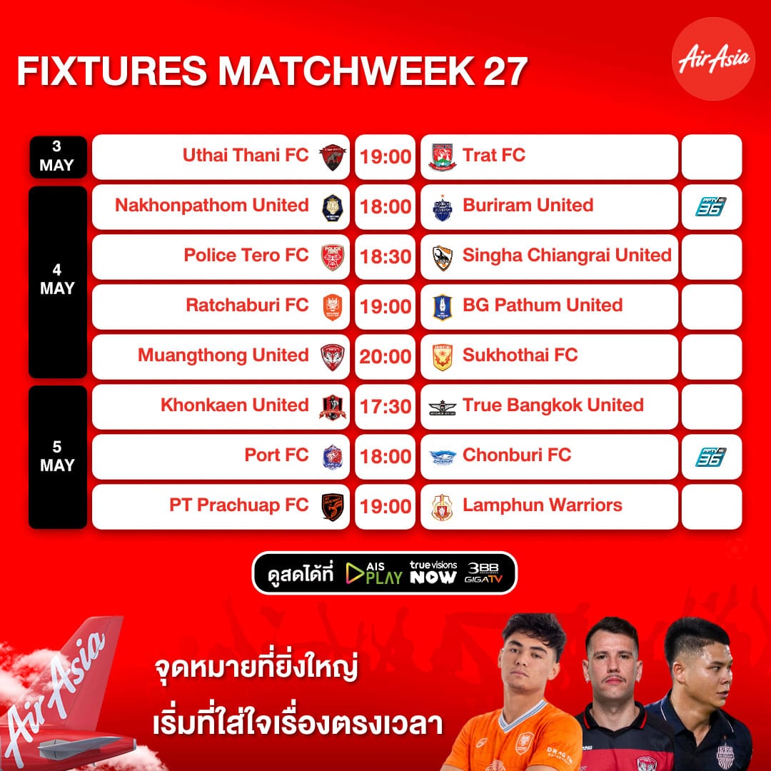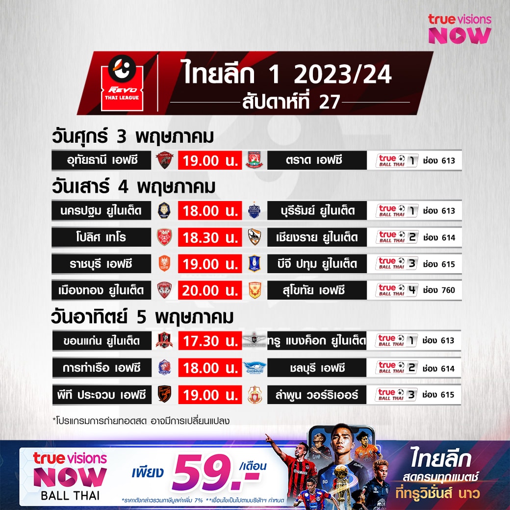ตารางแข่งขัน รีโว่ 2023/24 ไทยลีก โปรแกรมฟุตบอลไทยลีก สัปดาห์ที่ 27 ทุกคู่ถ่ายทอดสดทาง AIS Play และ True Ball Thai