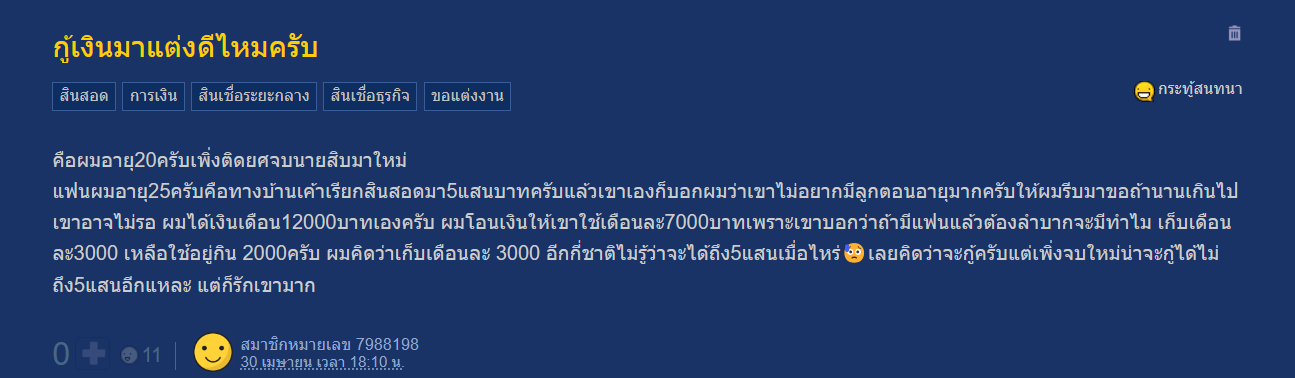 กลายเป็นประเด็นที่พูดถึงบนโลกโซเชียลมีเดียอย่างมาก หลังมีผู้ใช้พันทิป สมาชิกหมายเลข 7988198 ได้ออกมาตั้งคำถามไว้ว่า “กู้เงินมาแต่งดีไหมครับ คือผมอายุ20ครับเพิ่งติดยศจบนายสิบมาใหม่ แฟนผมอายุ25ครับคือทางบ้านเค้าเรียกสินสอดมา5แสนบาทครับแล้วเขาเองก็บอกผมว่าเขาไม่อยากมีลูกตอนอายุมากครับให้ผมรีบมาขอถ้านานเกินไปเขาอาจไม่รอ ผมได้เงินเดือน 12000 บาทเองครับ ผมโอนเงินให้เขาใช้เดือนละ 7000 บาทเพราะเขาบอกว่าถ้ามีแฟนแล้วต้องลำบากจะมีทำไม เก็บเดือนละ 3000 เหลือใช้อยู่กิน 2000 ครับ ผมคิดว่าเก็บเดือนละ 3000 อีกกี่ชาติไม่รู้ว่าจะได้ถึง5แสนเมื่อไหร่😥เลยคิดว่าจะกู้ครับแต่เพิ่งจบใหม่น่าจะกู้ได้ไม่ถึง5แสนอีกแหละ แต่ก็รักเขามาก”
