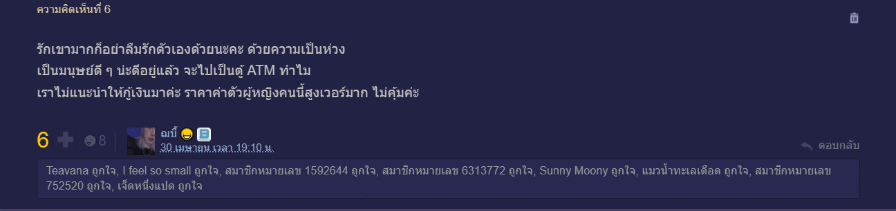 “รักเขามากก็อย่าลืมรักตัวเองด้วยนะคะ ด้วยความเป็นห่วง เป็นมนุษย์ดี ๆ น่ะดีอยู่แล้ว จะไปเป็นตู้ ATM ทำไม เราไม่แนะนำให้กู้เงินมาค่ะ ราคาค่าตัวผู้หญิงคนนี้สูงเวอร์มาก ไม่คุ้มค่ะ”