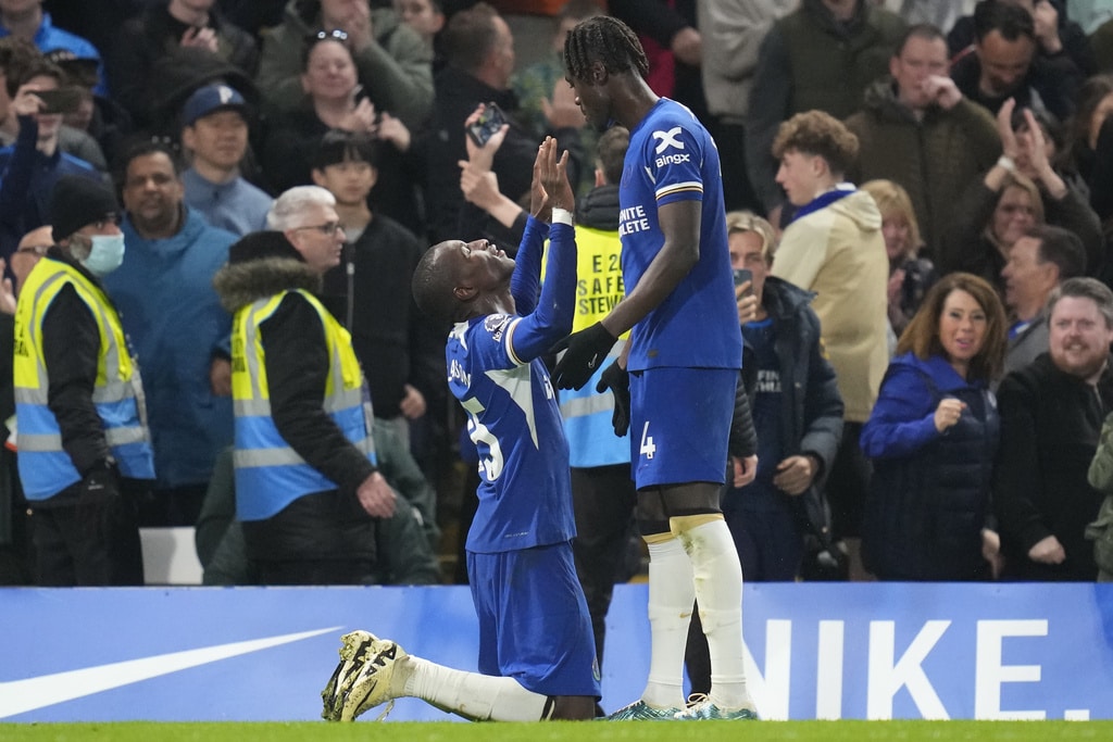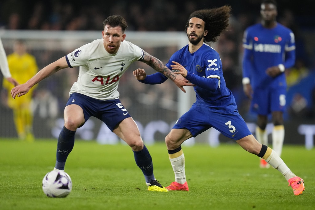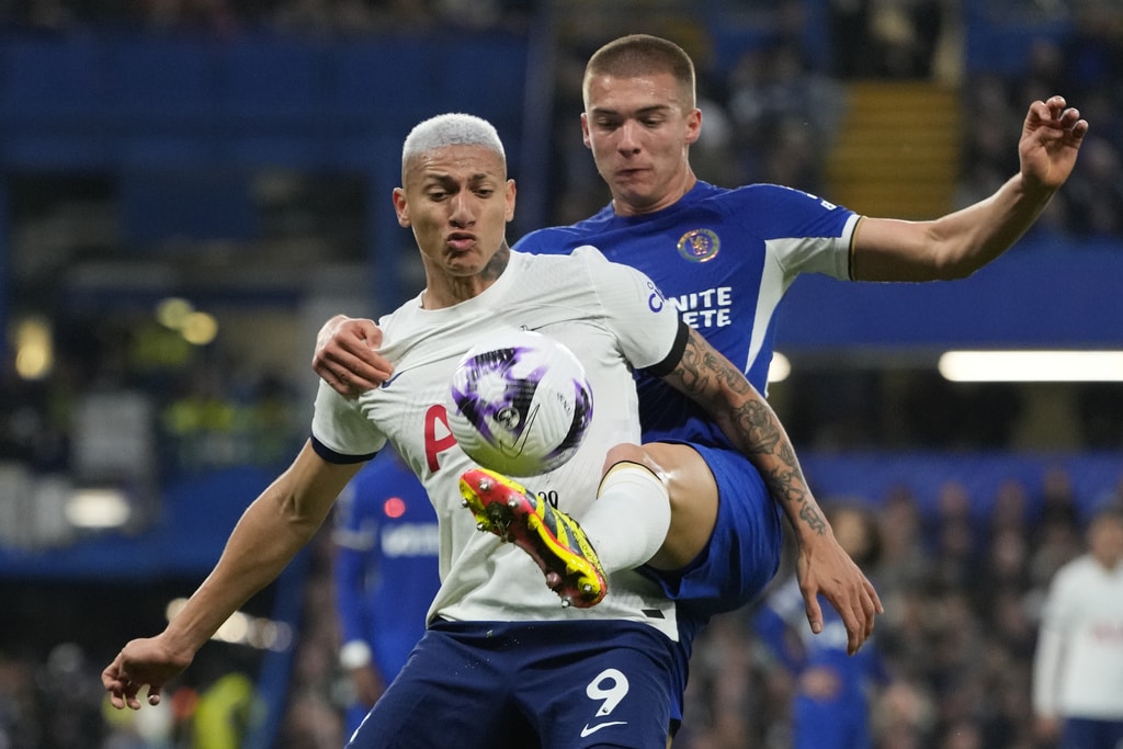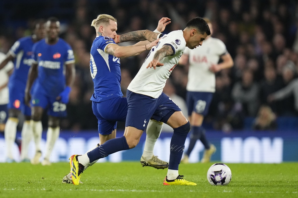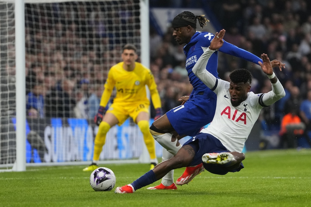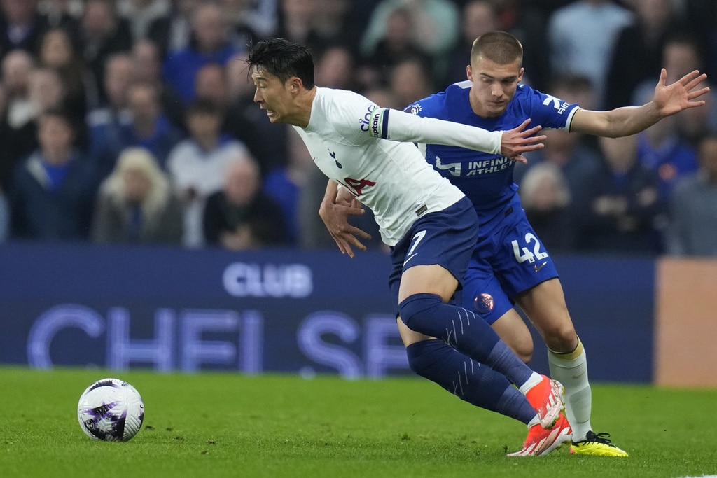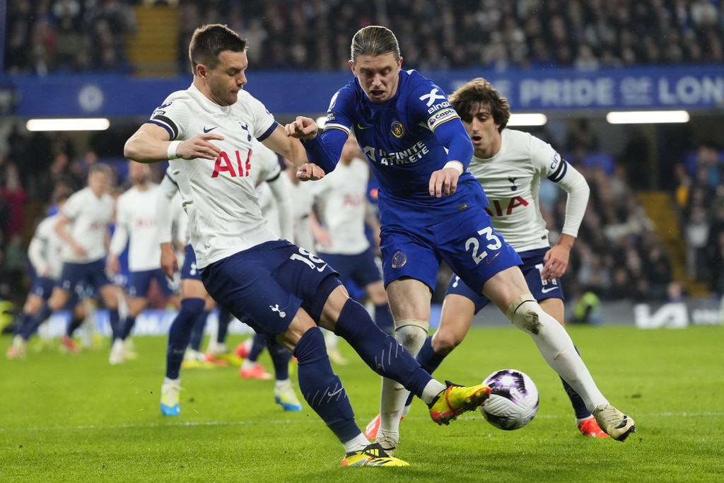 Tottenham’s Emerson Royal, right, is challenged by Chelsea’s Noni Madueke during the English Premier League soccer match between Chelsea and Tottenham Hotspur at Stamford Bridge stadium in London, Thursday, May 2, 2024. (AP Photo/Kirsty Wigglesworth)Chelsea’s Conor Gallagher, right, is challenged by Tottenham’s Giovani Lo Celso, left, during the English Premier League soccer match between Chelsea and Tottenham Hotspur at Stamford Bridge stadium in London, Thursday, May 2, 2024. (AP Photo/Kirsty Wigglesworth)Chelsea’s Marc Cucurella, centre, is challenged by Tottenham’s Dejan Kulusevski, right, during the English Premier League soccer match between Chelsea and Tottenham Hotspur at Stamford Bridge stadium in London, Thursday, May 2, 2024. (AP Photo/Kirsty Wigglesworth)Tottenham’s Pierre-Emile Hojbjerg, left, is challenged by Chelsea’s Marc Cucurella during the English Premier League soccer match between Chelsea and Tottenham Hotspur at Stamford Bridge stadium in London, Thursday, May 2, 2024. (AP Photo/Kirsty Wigglesworth)Chelsea’s Nicolas Jackson scores his side’s second goal during the English Premier League soccer match between Chelsea and Tottenham Hotspur at Stamford Bridge stadium in London, Thursday, May 2, 2024. (AP Photo/Kirsty Wigglesworth)Tottenham’s Cristian Romero, right, is challenged by Chelsea’s Mykhailo Mudryk during the English Premier League soccer match between Chelsea and Tottenham Hotspur at Stamford Bridge stadium in London, Thursday, May 2, 2024. (AP Photo/Kirsty Wigglesworth)Tottenham’s Richarlison is challenged by Chelsea’s Alfie Gilchrist, rear, during the English Premier League soccer match between Chelsea and Tottenham Hotspur at Stamford Bridge stadium in London, Thursday, May 2, 2024. (AP Photo/Kirsty Wigglesworth)Tottenham’s Cristian Romero, right, reacts after a missed chance during the English Premier League soccer match between Chelsea and Tottenham Hotspur at Stamford Bridge stadium in London, Thursday, May 2, 2024. (AP Photo/Kirsty Wigglesworth)Tottenham’s Son Heung-min, left, is challenged by Chelsea’s Alfie Gilchrist during the English Premier League soccer match between Chelsea and Tottenham Hotspur at Stamford Bridge stadium in London, Thursday, May 2, 2024. (AP Photo/Kirsty Wigglesworth)