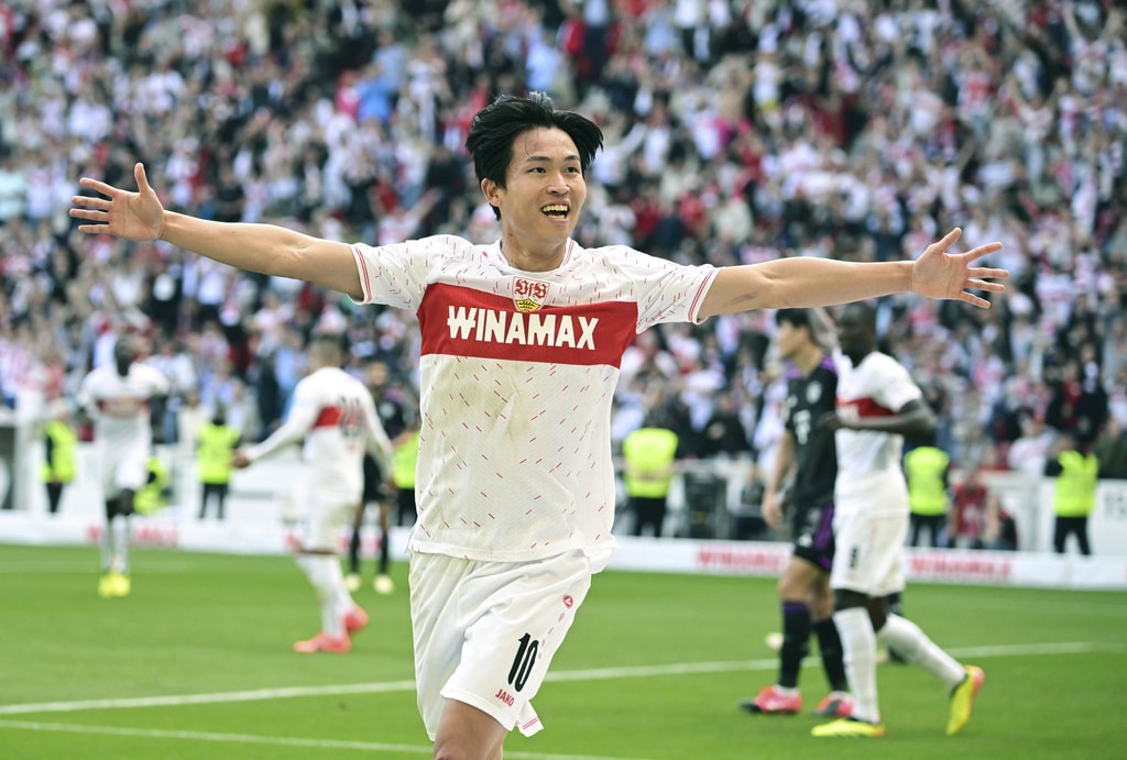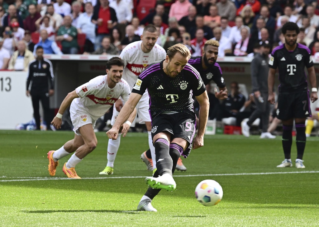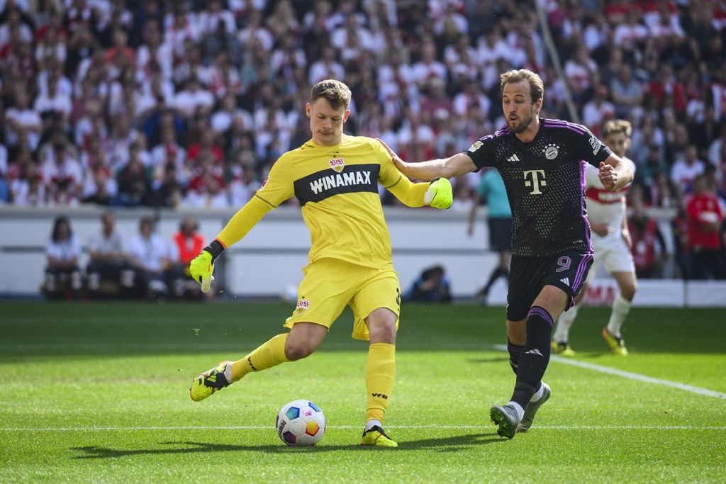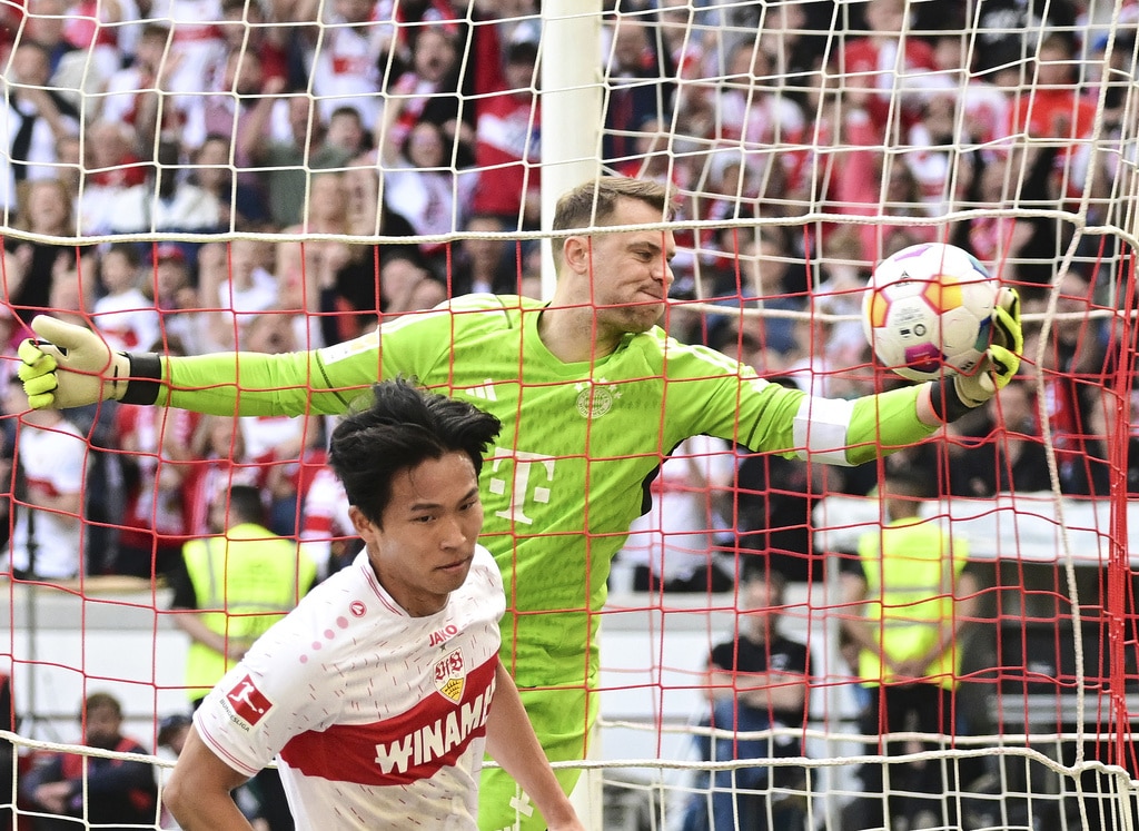 Munich’s Alphonso Davies, centre, vies for the ball with Stuttgart’s Jamie Leweling, left and Deniz Undav during the German Bundesliga soccer match between Bayern Munich and VfB Stuttgart, in Stuttgart, Germany, Saturday, May 4, 2024. (Tom Weller/dpa via AP)Stuttgart’s Wooyeong Jeong scores a goal, during the German Bundesliga soccer match between Bayern Munich and VfB Stuttgart, in Stuttgart, Germany, Saturday, May 4, 2024. (Bernd Wei’brod/dpa via AP)Stuttgart’s Wooyeong Jeong celebrates scoring a goal, during the German Bundesliga soccer match between Bayern Munich and VfB Stuttgart, in Stuttgart, Germany, Saturday, May 4, 2024. (Bernd Wei’brod/dpa via AP)Stuttgart goalkeeper Alexander Nübel, left, vies for the ball with Munich’s Harry Kane, during the German Bundesliga soccer match between Bayern Munich and VfB Stuttgart, in Stuttgart, Germany, Saturday, May 4, 2024. (Tom Weller/dpa via AP)Munich’s Alphonso Davies, left, vies for the ball with Stuttgart’s Jamie Leweling, during the German Bundesliga soccer match between Bayern Munich and VfB Stuttgart, in Stuttgart, Germany, Saturday, May 4, 2024. (Bernd Wei’brod/dpa via AP)Munich’s Harry Kane makes a shot on goal, during the German Bundesliga soccer match between Bayern Munich and VfB Stuttgart, in Stuttgart, Germany, Saturday, May 4, 2024. (Bernd Wei’brod/dpa via AP)Stuttgart’s Leonidas Stergiou celebrates scoring a goal, during the German Bundesliga soccer match between Bayern Munich and VfB Stuttgart, in Stuttgart, Germany, Saturday, May 4, 2024. (Tom Weller/dpa via AP)Stuttgart’s Wooyeong Jeong celebrates scoring a goal, during the German Bundesliga soccer match between Bayern Munich and VfB Stuttgart, in Stuttgart, Germany, Saturday, May 4, 2024. (Bernd Wei’brod/dpa via AP)