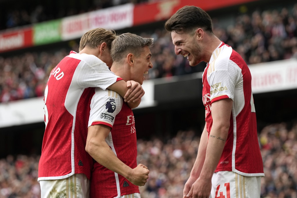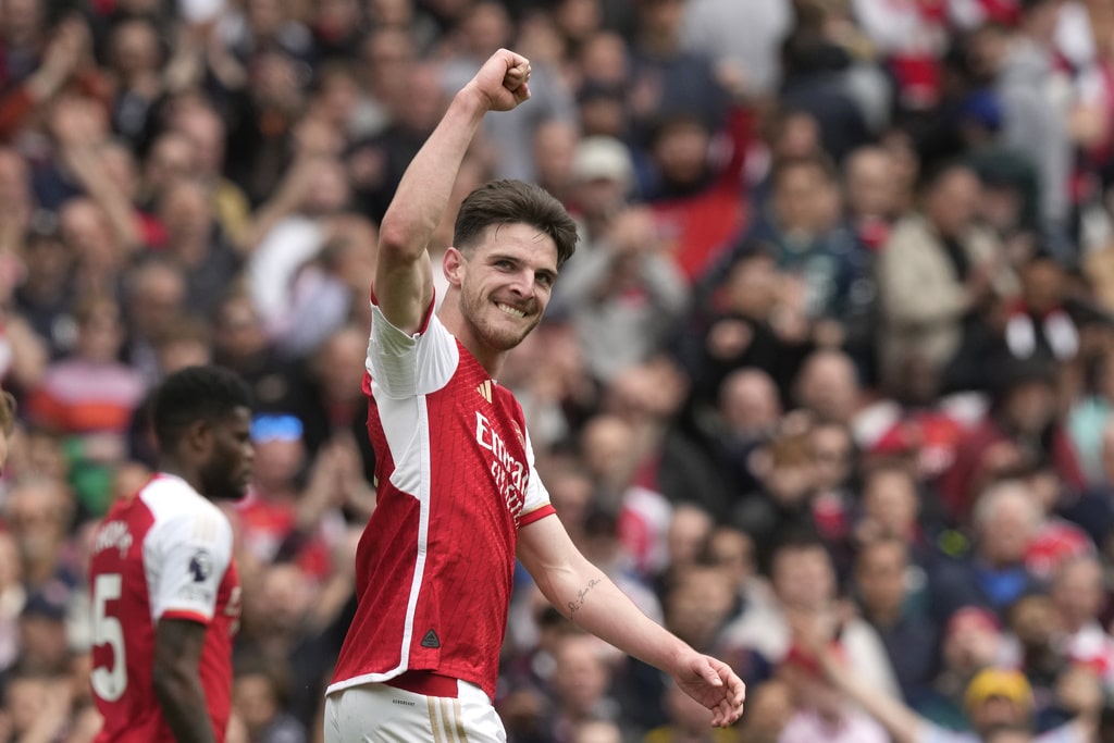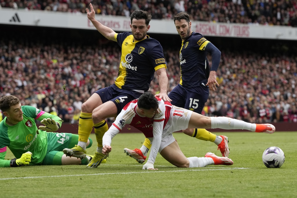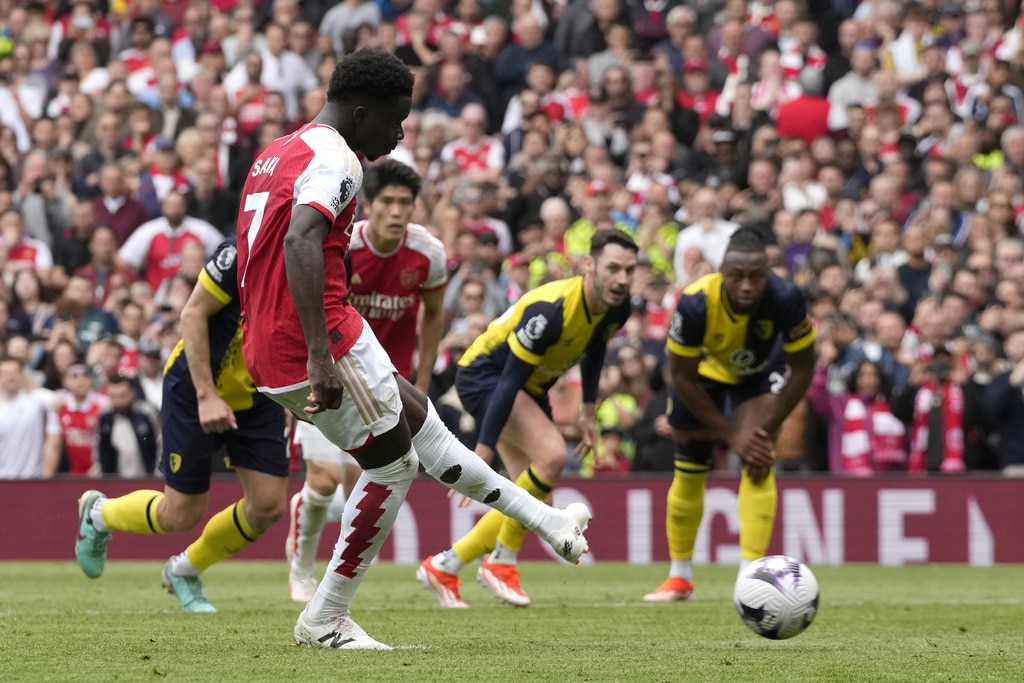 Arsenal’s Bukayo Saka scores on a penalty kick during the English Premier League soccer match between Arsenal and Bournemouth at Emirates Stadium in London, England, Saturday, May 4, 2024. (AP Photo/Frank Augstein)Arsenal players applaud supporters at the end of the English Premier League soccer match between Arsenal and Bournemouth at Emirates Stadium in London, England, Saturday, May 4, 2024. (AP Photo/Frank Augstein)Arsenal’s Declan Rice celebrates after scoring his side’s third goal during the English Premier League soccer match between Arsenal and Bournemouth at Emirates Stadium in London, England, Saturday, May 4, 2024. (AP Photo/Frank Augstein)Arsenal’s Gabriel, centre, reacts after missing a scoring chance during the English Premier League soccer match between Arsenal and Bournemouth at Emirates Stadium in London, England, Saturday, May 4, 2024. (AP Photo/Frank Augstein)Arsenal’s Gabriel Martinelli, bottom, challenges for the ball with Bournemouth’s Lewis Cook, centre, and Bournemouth’s Adam Smith, right, during the English Premier League soccer match between Arsenal and Bournemouth at Emirates Stadium in London, England, Saturday, May 4, 2024. (AP Photo/Frank Augstein)Arsenal’s Leandro Trossard celebrates after scoring his side’s second goal during the English Premier League soccer match between Arsenal and Bournemouth at Emirates Stadium in London, England, Saturday, May 4, 2024. (AP Photo/Frank Augstein)Arsenal’s Takehiro Tomiyasu, right, heads the ball during the English Premier League soccer match between Arsenal and Bournemouth at Emirates Stadium in London, England, Saturday, May 4, 2024. (AP Photo/Frank Augstein)Bournemouth’s Dango Ouattara, left, challenges for the ball with Arsenal’s Bukayo Saka during the English Premier League soccer match between Arsenal and Bournemouth at Emirates Stadium in London, England, Saturday, May 4, 2024. (AP Photo/Frank Augstein)Bournemouth’s goalkeeper Mark Travers challenges for the ball with Arsenal’s Kai Havertz during the English Premier League soccer match between Arsenal and Bournemouth at Emirates Stadium in London, England, Saturday, May 4, 2024. (AP Photo/Frank Augstein)Arsenal’s manager Mikel Arteta reacts during the English Premier League soccer match between Arsenal and Bournemouth at Emirates Stadium in London, England, Saturday, May 4, 2024. (AP Photo/Frank Augstein)