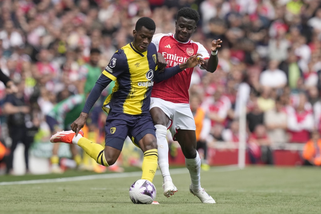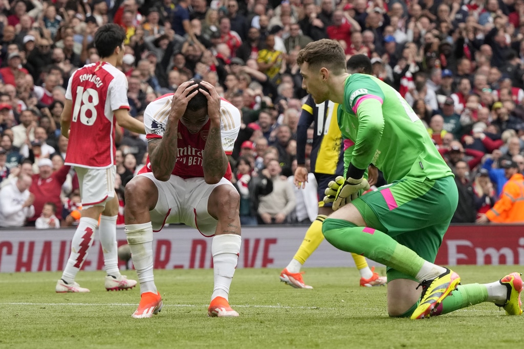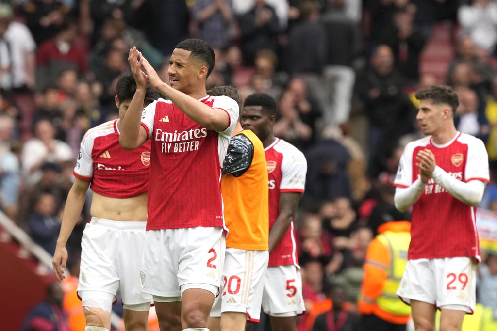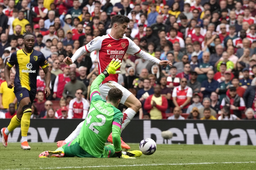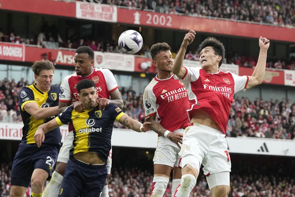 Arsenal’s Bukayo Saka scores on a penalty kick during the English Premier League soccer match between Arsenal and Bournemouth at Emirates Stadium in London, England, Saturday, May 4, 2024. (AP Photo/Frank Augstein)Arsenal players applaud supporters at the end of the English Premier League soccer match between Arsenal and Bournemouth at Emirates Stadium in London, England, Saturday, May 4, 2024. (AP Photo/Frank Augstein)Arsenal’s Declan Rice celebrates after scoring his side’s third goal during the English Premier League soccer match between Arsenal and Bournemouth at Emirates Stadium in London, England, Saturday, May 4, 2024. (AP Photo/Frank Augstein)Arsenal’s Gabriel, centre, reacts after missing a scoring chance during the English Premier League soccer match between Arsenal and Bournemouth at Emirates Stadium in London, England, Saturday, May 4, 2024. (AP Photo/Frank Augstein)Arsenal’s Gabriel Martinelli, bottom, challenges for the ball with Bournemouth’s Lewis Cook, centre, and Bournemouth’s Adam Smith, right, during the English Premier League soccer match between Arsenal and Bournemouth at Emirates Stadium in London, England, Saturday, May 4, 2024. (AP Photo/Frank Augstein)Arsenal’s Leandro Trossard celebrates after scoring his side’s second goal during the English Premier League soccer match between Arsenal and Bournemouth at Emirates Stadium in London, England, Saturday, May 4, 2024. (AP Photo/Frank Augstein)Arsenal’s Takehiro Tomiyasu, right, heads the ball during the English Premier League soccer match between Arsenal and Bournemouth at Emirates Stadium in London, England, Saturday, May 4, 2024. (AP Photo/Frank Augstein)Bournemouth’s Dango Ouattara, left, challenges for the ball with Arsenal’s Bukayo Saka during the English Premier League soccer match between Arsenal and Bournemouth at Emirates Stadium in London, England, Saturday, May 4, 2024. (AP Photo/Frank Augstein)Bournemouth’s goalkeeper Mark Travers challenges for the ball with Arsenal’s Kai Havertz during the English Premier League soccer match between Arsenal and Bournemouth at Emirates Stadium in London, England, Saturday, May 4, 2024. (AP Photo/Frank Augstein)Arsenal’s manager Mikel Arteta reacts during the English Premier League soccer match between Arsenal and Bournemouth at Emirates Stadium in London, England, Saturday, May 4, 2024. (AP Photo/Frank Augstein)