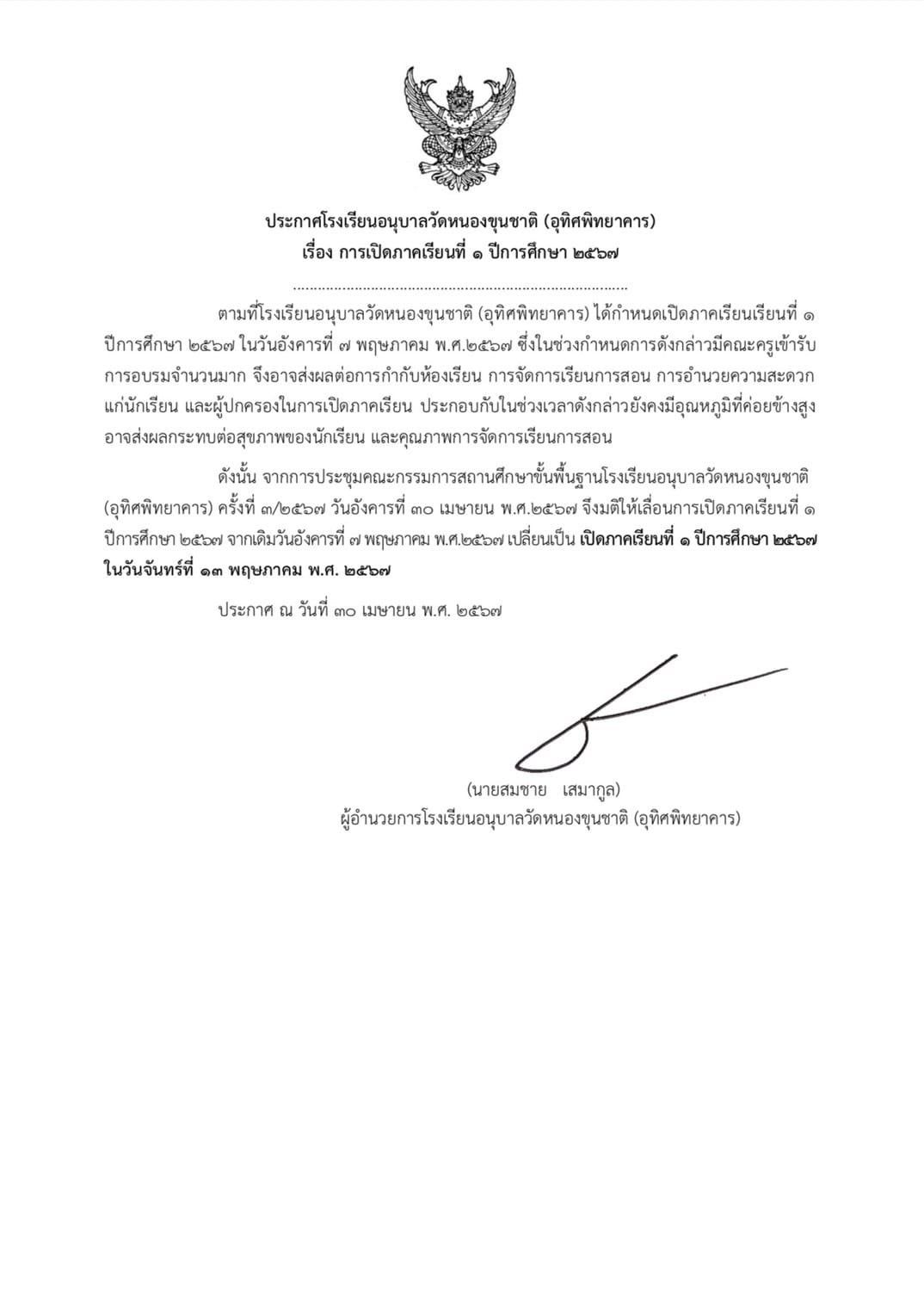 โดยทางโรงเรียนระบุว่า “ตามที่โรงเรียนอนุบาลวัดหนองขุนชาติ (อุทิศพิทยาคาร) ได้กำหนดเปิดภาคเรียนเรียนที่ 1 ปีการศึกษา 2567 ในวันอังคารที่ 7 พฤษภาคม พ.ศ.2567 ซึ่งในช่วงกำหนดการดังกล่าวมีคณะครูเข้ารับ การอบรมจำนวนมาก จึงอาจส่งผลต่อการกำกับห้องเรียน การจัดการเรียนการสอน การอำนวยความสะดวก แก่นักเรียน และผู้ปกครองในการเปิดภาคเรียน ประกอบกับในช่วงเวลาดังกล่าวยังคงมีอุณหภูมิที่ค่อยข้างสูง อาจส่งผลกระทบต่อสุขภาพของนักเรียน และคุณภาพการจัดการเรียนการสอน