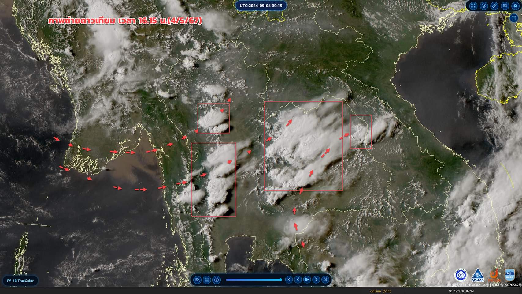 นอกจากนี้ กรมอุตุนิยมวิทยาได้เผยแพร่ภาพ ภาพถ่ายดาวเทียมและเรดาร์ เวลา 16.15 น.(4/5/67) เมฆและฝนฟ้าคะนองเพิ่มขึ้นบริเวณภาคอีสาน และภาคกลาง ส่วนภาคใต้เมฆฝนฟ้าคะนองปกคลุมทางด้านฝั่งอ่าวไทย