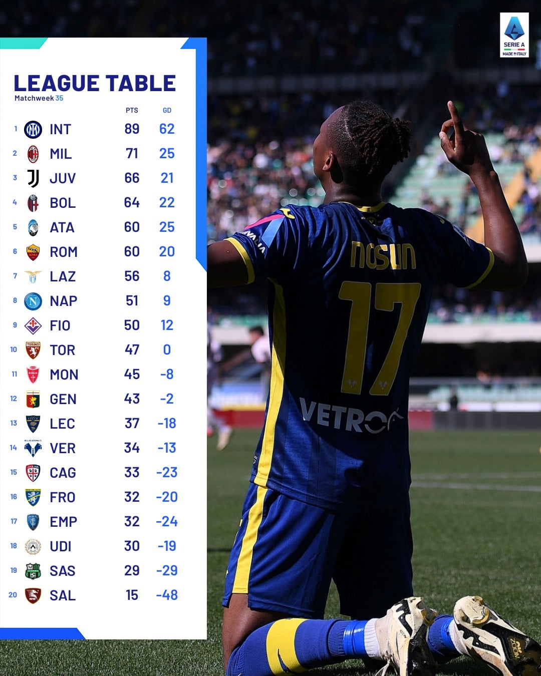 สรุปผลการแข่งขัน กัลโช่ เซเรียอา 2023/24 หลังจบนัดที่ 35