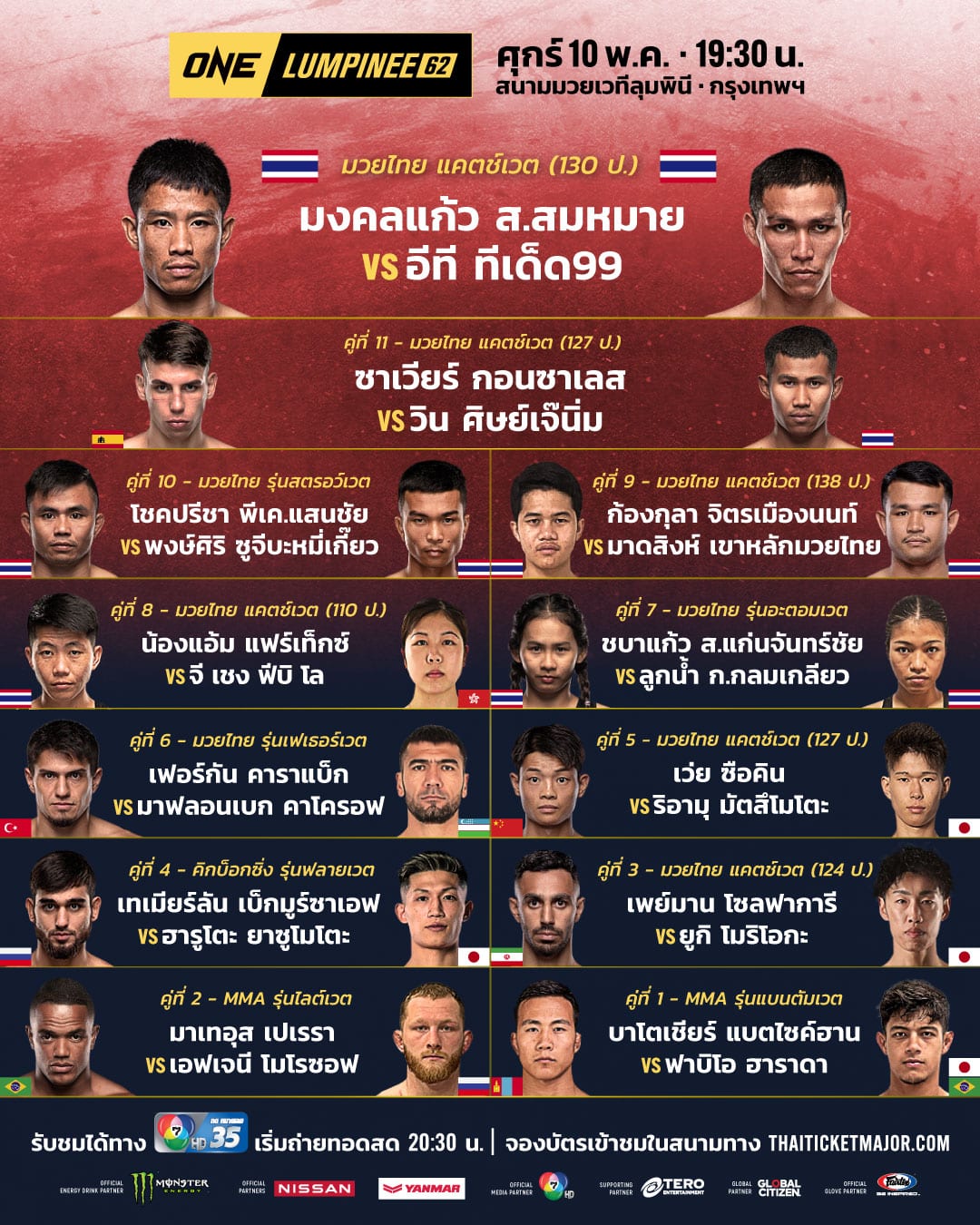 โปรแกรมการแข่งขันทุกคู่ศึก ONE ลุมพินี 62