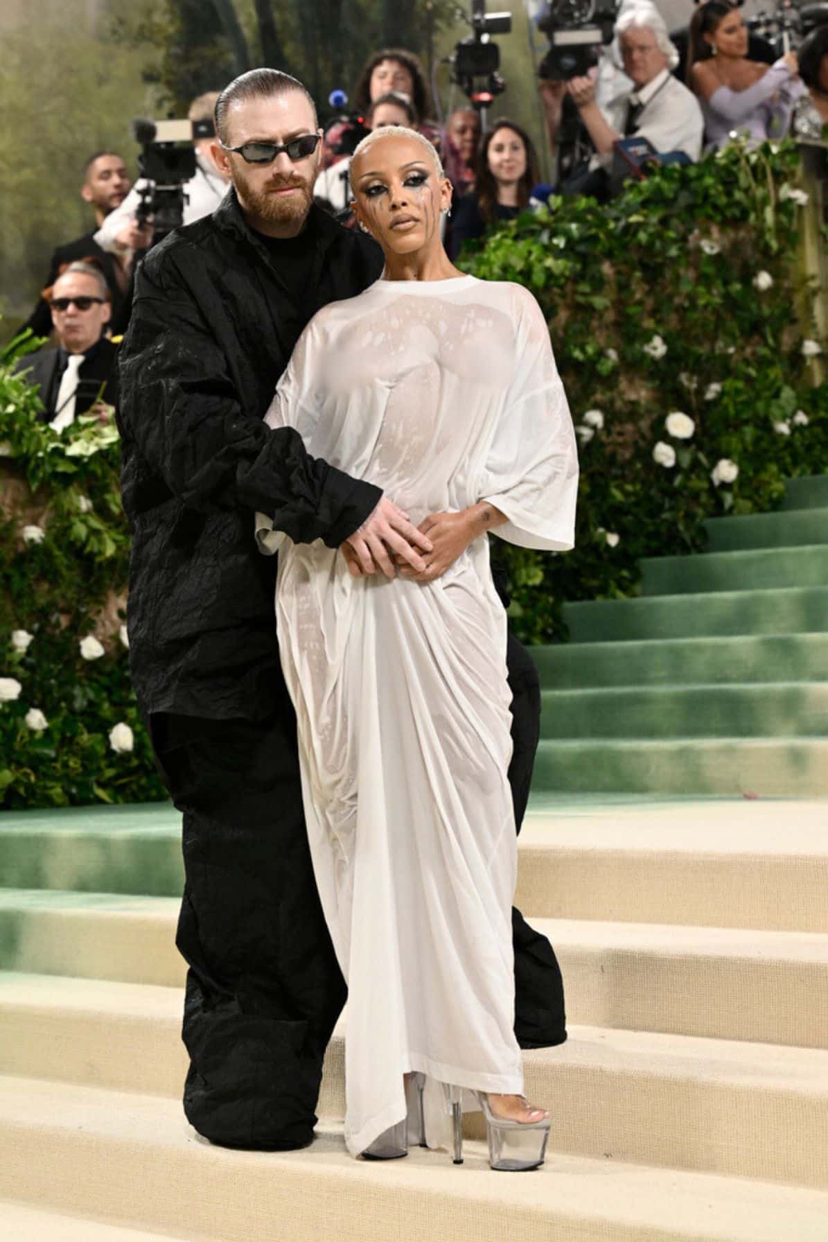 Doja Cat สร้างความฮือฮาบนพรมแดง Met Gala 2024 ด้วยมาสคาร่าลายน้ำตาสีโครเมี่ยมและเสื้อยืดเปียก เห็นทะลุหัวนม