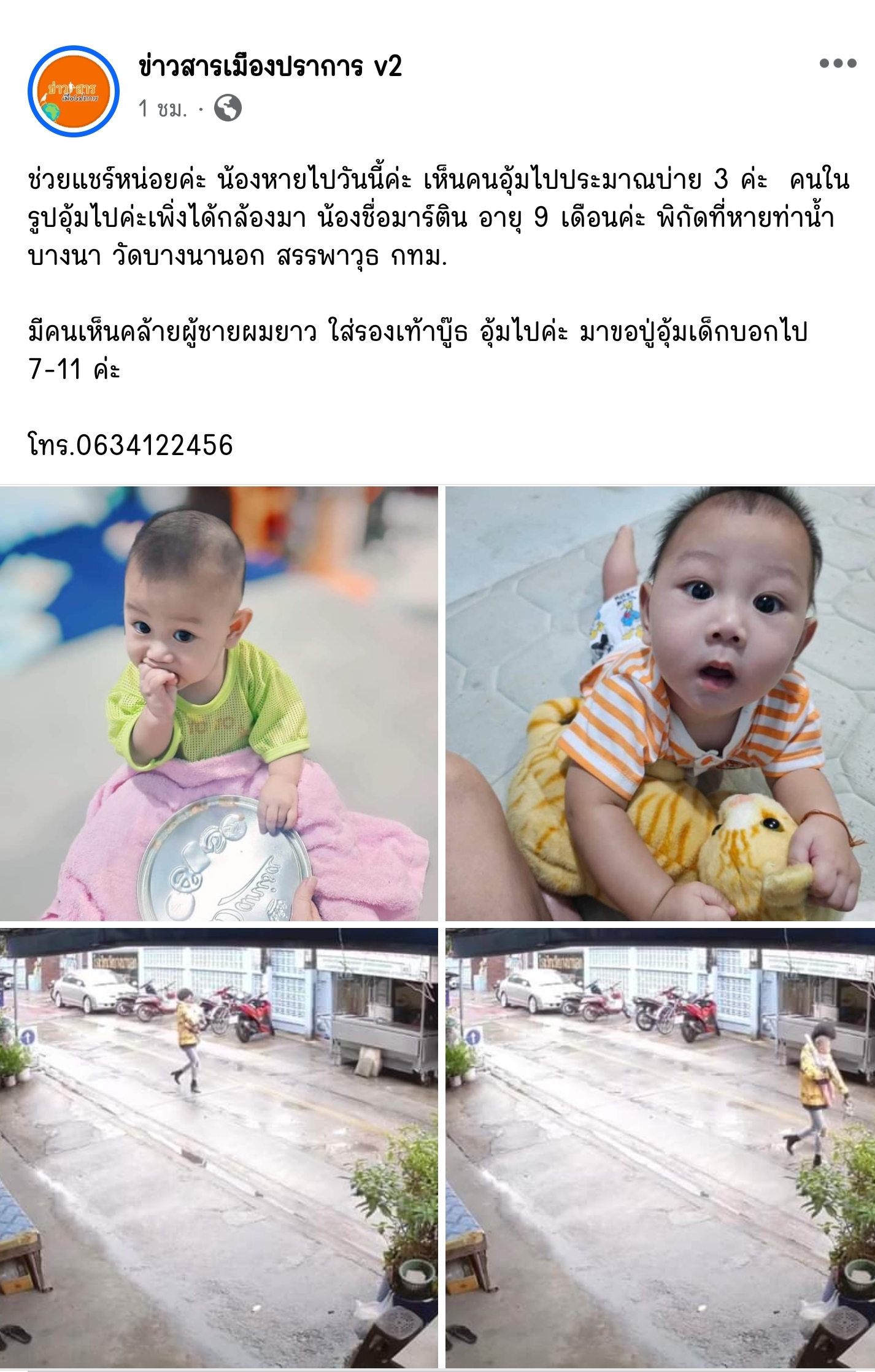 “ช่วยแชร์หน่อยค่ะ น้องหายไปวันนี้ค่ะ เห็นคนอุ้มไปประมาณบ่าย 3 ค่ะ คนในรูปอุ้มไปค่ะเพิ่งได้กล้องมา น้องชื่อมาร์ติน อายุ 9 เดือนค่ะ พิกัดที่หายท่าน้ำบางนา วัดบางนานอก สรรพาวุธ กทม.