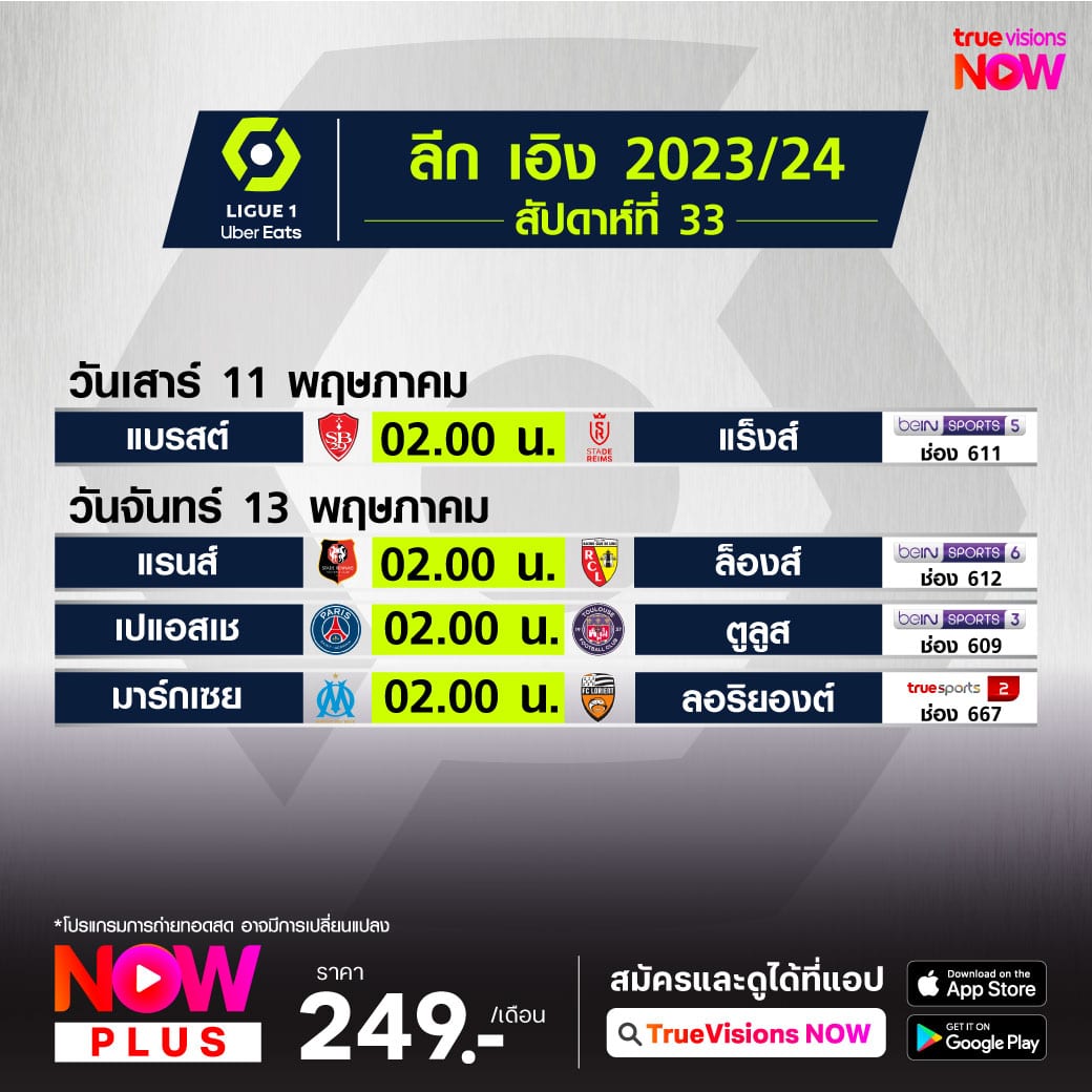 ตารางแข่งขัน ลีกเอิง ฝรั่งเศส โปรแกรมฟุตบอล ลีกเอิง 2023/24 สัปดาห์ที่ 33 ถ่ายทอดสดทาง beIN Sports และ True Sports