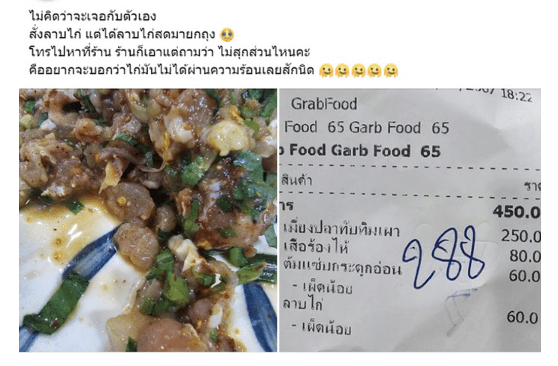 “ไม่คิดว่าจะเจอกับตัวเอง สั่งลาบไก่ แต่ได้ลาบไก่สดมายกถุง โทร. ไปหาที่ร้าน ร้านก็เอาแต่ถามว่า ไม่สุกส่วนไหนคะ คืออยากจะบอกว่าไก่มันไม่ได้ผ่านความร้อนเลยสักนิด”