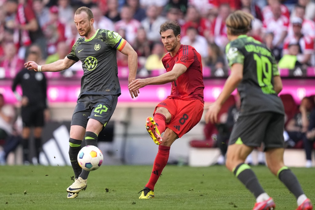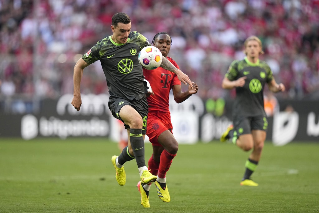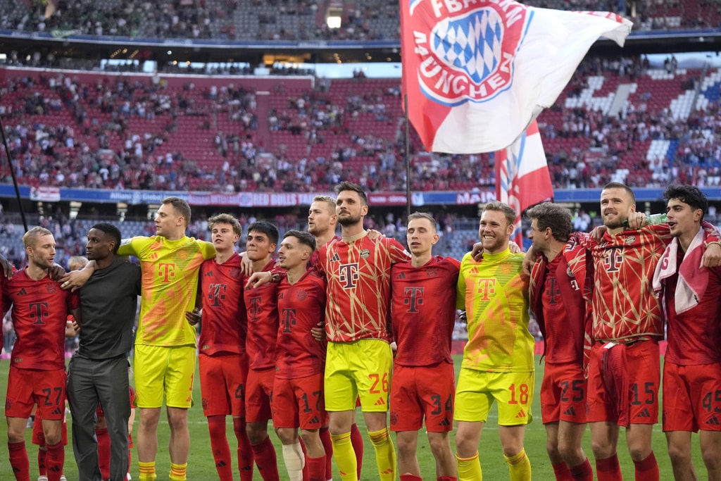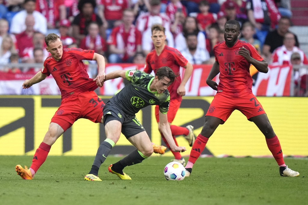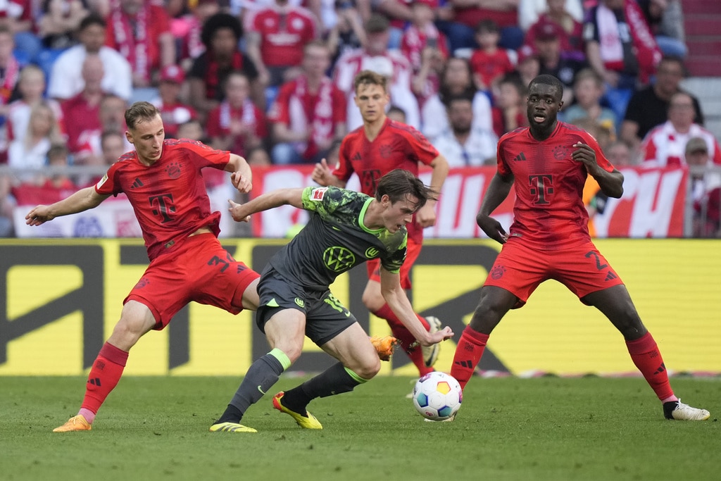 Bayern’s Lovro Zvonarek scores his side’s opening goal during the German Bundesliga soccer match between Bayern Munich and VfL Wolfsburg at the Allianz Arena in Munich, Germany, Sunday, May 12, 2024. (AP Photo/Matthias Schrader)Bayern Munich players celebrate their victory at the German Bundesliga soccer match between Bayern Munich and VfL Wolfsburg at the Allianz Arena in Munich, Germany, Sunday, May 12, 2024. (AP Photo/Matthias Schrader)Bayern Munich players celebrate their victory at the German Bundesliga soccer match between Bayern Munich and VfL Wolfsburg at the Allianz Arena in Munich, Germany, Sunday, May 12, 2024. (AP Photo/Matthias Schrader)Bayern’s Lovro Zvonarek, left, challenges for the ball with Wolfsburg’s Jakub Kaminski during the German Bundesliga soccer match between Bayern Munich and VfL Wolfsburg at the Allianz Arena in Munich, Germany, Sunday, May 12, 2024. (AP Photo/Matthias Schrader)Wolfsburg’s Maximilian Arnold, right, challenges for the ball with Bayern’s Mathys Tel during the German Bundesliga soccer match between Bayern Munich and VfL Wolfsburg at the Allianz Arena in Munich, Germany, Sunday, May 12, 2024. (AP Photo/Matthias Schrader)Wolfsburg’s Cedric Zesiger, left, challenges for the ball with Bayern’s Mathys Tel during the German Bundesliga soccer match between Bayern Munich and VfL Wolfsburg at the Allianz Arena in Munich, Germany, Sunday, May 12, 2024. (AP Photo/Matthias Schrader)Bayern’s goalkeeper Manuel Neuer, left, talks with Bayern’s Leon Goretzka during the German Bundesliga soccer match between Bayern Munich and VfL Wolfsburg at the Allianz Arena in Munich, Germany, Sunday, May 12, 2024. (AP Photo/Matthias Schrader)Bayern’s Lovro Zvonarek, left, challenges for the ball with Wolfsburg’s Jakub Kaminski during the German Bundesliga soccer match between Bayern Munich and VfL Wolfsburg at the Allianz Arena in Munich, Germany, Sunday, May 12, 2024. (AP Photo/Matthias Schrader)Bayern’s head coach Thomas Tuchel follows the game during the German Bundesliga soccer match between Bayern Munich and VfL Wolfsburg at the Allianz Arena in Munich, Germany, Sunday, May 12, 2024. (AP Photo/Matthias Schrader)Bayern’s Leon Goretzka, centre, kicks the ball ahead of Wolfsburg’s Maximilian Arnold during the German Bundesliga soccer match between Bayern Munich and VfL Wolfsburg at the Allianz Arena in Munich, Germany, Sunday, May 12, 2024. (AP Photo/Matthias Schrader)