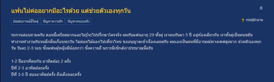 กลายเป็นประเด็นที่พูดถึงบนโลกโซเชียลมีเดียอย่างมาก หลังมีผู้ใช้พันทิป สมาชิกหมายเลข 5317666 ได้ออกมาตั้งคำถามไว้ว่า “แฟนไม่ค่อยอยากมีอะไรด้วย แต่ช่วยตัวเองทุกวัน รบกวนสอบถามครับ ตอนนี้เครียดมากและไม่รู้จะไปปรึกษาใครจริง ผมกับแฟนอายุ 29 ทั้งคู่ เราคบกันมา 5 ปี อยู่ห้องเดียวกัน เราทั้งคู่เป็นคนขยันทำงานทำงานกันจนดึกดื่นเกือบทุกวัน ไม่ค่อยได้ออกไปเที่ยวไหน ขออนุญาตเข้าเรื่องเลยครับ ผมเองเป็นคนที่มีอารมณ์ทางเพศสูงมาก ช่วยตัวเองทุกวัน วันละ 2-3 รอบ ซึ่งแฟนผู้หญิงมีน้อยกว่า ซึ่งความถี่ การมีเซ็กส์เราประมาณนี้ครับ 1-2 ปีแรกที่คบกัน อาทิตย์ละ 2 ครั้ง ปีที่ 2-3 อาทิตย์ละครั้ง ปีที่ 3-5 ปี สองอาทิตย์ครั้ง ถึงเดือนละครั้ง