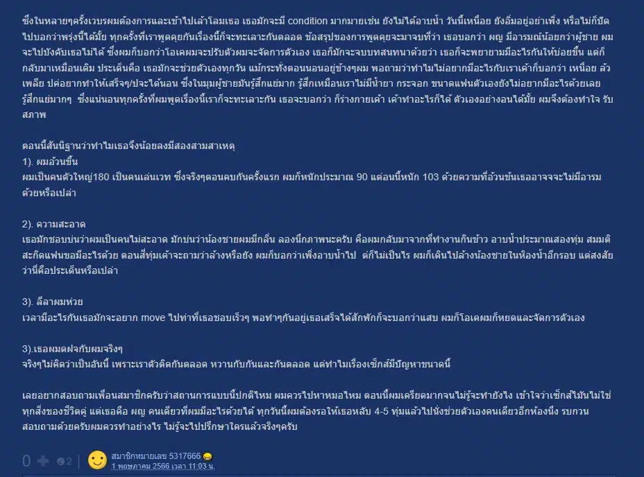 “ซึ่งในหลายๆครั้งเวบรผมต้องการและเข้าไปเล้าโลมเธอ เธอมักจะมี condition มากมายเช่น ยังไม่ได้อาบน้ำ วันนี้เหนื่อย ยังอิ่มอยู่อย่าเพิ่ง หรือไม่ก็ปัดไปบอกว่าพรุ่งนี้ได้มั้ย ทุกครั้งที่เราพูดคุยกันเรื่องนี้ก็จะทะเลาะกันตลอด ข้อสรุปของการพูดคุยจะมาจบที่ว่า เธอบอกว่า ผญ มีอารมณ์น้อยกว่าผู้ชาย ผมจะไปบังคับเธอไม่ได้ ซึ่งผมก็บอกว่าโอเคผมจะปรับตัวผมจะจัดการตัวเอง เธอก็มักจะจบบทสนทนาด้วยว่า เธอก็จะพยายามมีอะไรกันให้บ่อยขึ้น แต่ก็กลับมาเหมือนเดิม ประเด็นคือ เธอมักจะช่วยตัวเองทุกวัน แม้กระทั่งตอนนอนอยู่ข้างๆผม พอถามว่าทำไมไม่อยากมีอะไรกับเราเค้าก็บอกว่า เหนื่อย ล้ว เพลีย ปค่อยากทำให้เสร็จๆ/ปจะได้นอน ซึ่งในมุมผู้ชายมันรู้สึกแย่มาก รู้สึกเหมือนเราไม่มีน้ำยา กระจอก ขนาดแฟนตัวเองยังไม่อยากมีอะไรด้วยเลย รู้สึกแย่มากๆ ซึ่งแน่นอนทุกครั้งที่ผมพูดเรื่องนี้เราก็จะทะเลาะกัน เธอจะบอกว่า ก็ร่างกายเค้า เค้าทำอะไรก็ได้ ตัวเองอย่างอนได้มั้ย ผมจึงต้องทำใจ รับสภาพ”