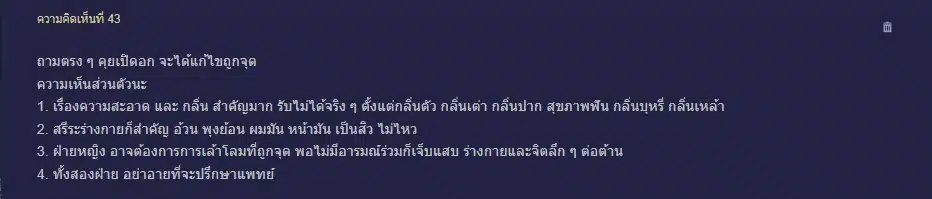 “ความเห็นส่วนตัวนะ 1. เรื่องความสะอาด และ กลิ่น สำคัญมาก รับไม่ได้จริง ๆ ตั้งแต่กลิ่นตัว กลิ่นเต่า กลิ่นปาก สุขภาพฟัน กลิ่นบุหรี่ กลิ่นเหล้า 2. สรีระร่างกายก็สำคัญ อ้วน พุงย้อน ผมมัน หน้ามัน เป็นสิว ไม่ไหว 3. ฝ่ายหญิง อาจต้องการการเล้าโลมที่ถูกจุด พอไม่มีอารมณ์ร่วมก็เจ็บแสบ ร่างกายและจิตลึก ๆ ต่อต้าน 4. ทั้งสองฝ่าย อย่าอายที่จะปรึกษาแพทย์”