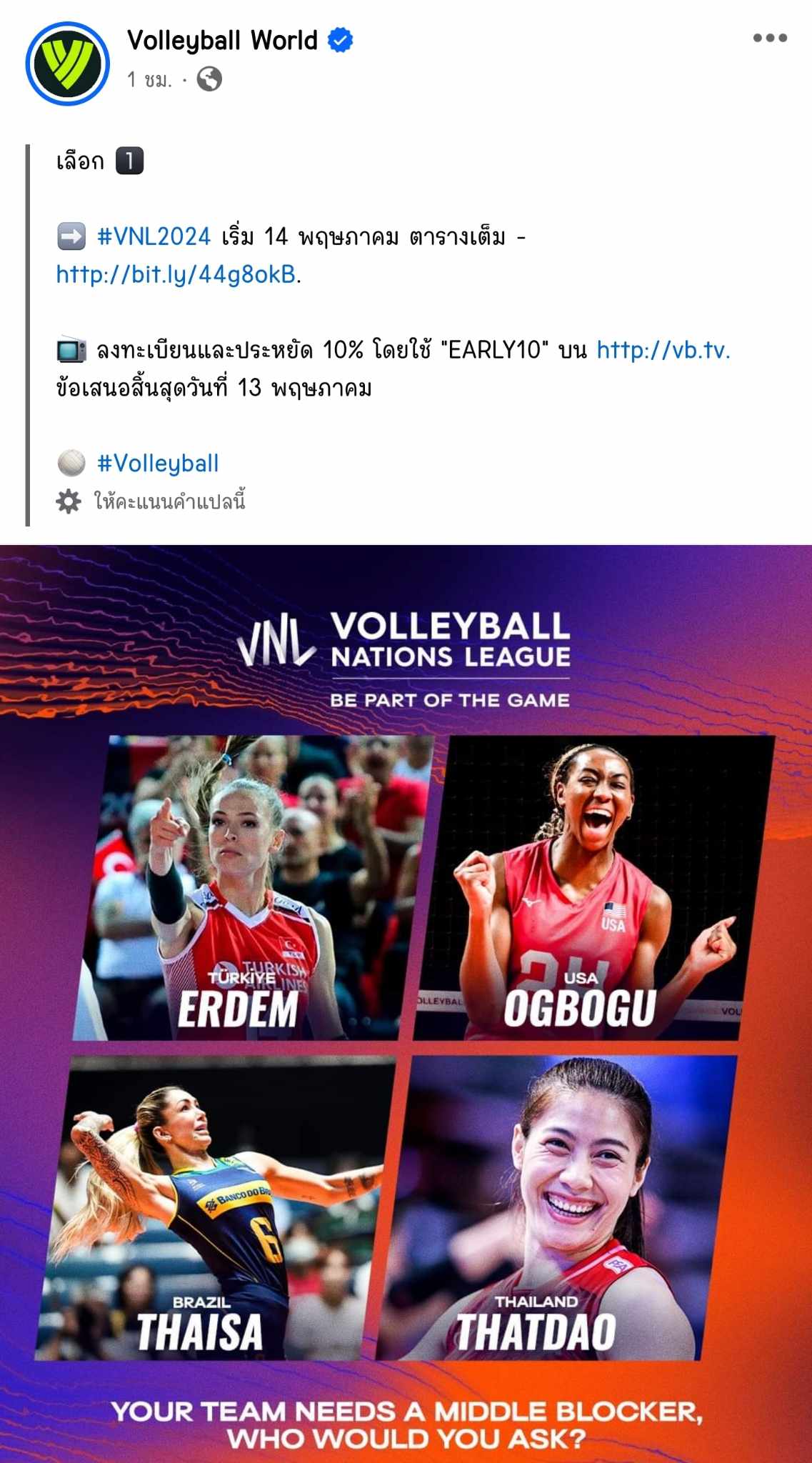 - ตัวตึงลูกยางไทย Volleyball World เลือกช็อตเด็ด “ทัดดาว” โปรโมต VNL 2024