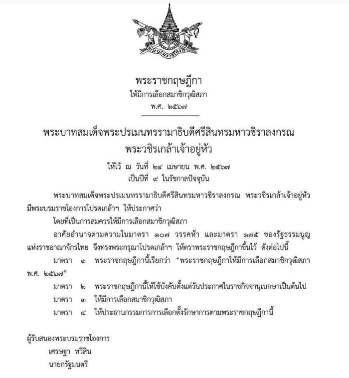 ด่วน! ในหลวง โปรดเกล้าฯ พระราชกฤษฎีกา ให้เลือก ส.ว. 2567