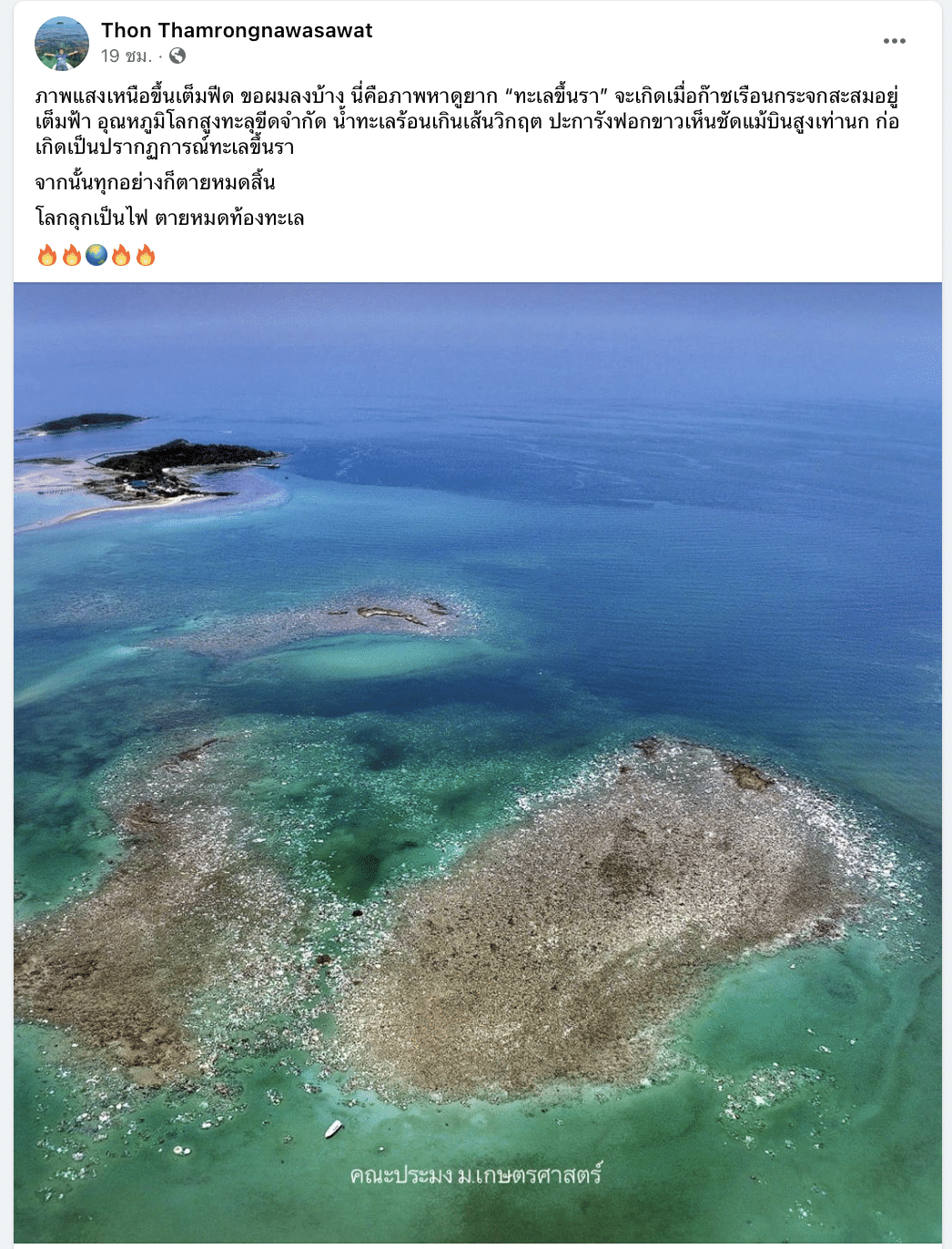 ผศ.ดร.ธรณ์ ธำรงนาวาสวัสดิ์ นักวิทยาศาสตร์ทางทะเลชื่อดัง จากภาควิชาวิทยาศาสตร์ทางทะเล คณะประมง มหาวิทยาลัยเกษตรศาสตร์ ได้โพสต์ภาพปรากฏการณ์ทางธรรมชาติที่น่าตื่นตระหนก ที่เรียกว่า “ทะเลขึ้นรา” ผ่านทางเฟซบุ๊กส่วนตัว ซึ่งเป็นภาพที่แสดงให้เห็นถึงผลกระทบรุนแรงของภาวะโลกร้อนต่อระบบนิเวศทางทะเล
