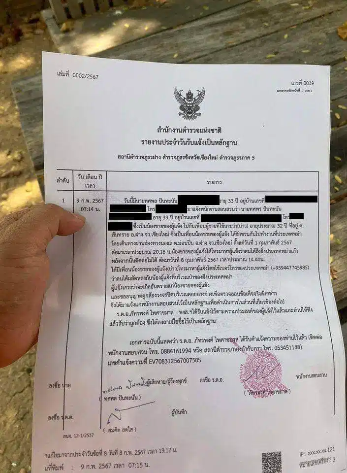 พร้อมกันนี้ได้แนบภาพใบบันทึกประจำวันแจ้งความคนหาย ระบุว่า แฝดพี่ได้เข้าแจ้งความกับเจ้าหน้าที่ตำรวจ สภ.ฝาง จ.เชียงใหม่ หลังนายทศพร ปันทะนัน น้องชายหายตัวไปอย่างไร้ร่องรอยในประเทศพม่า
