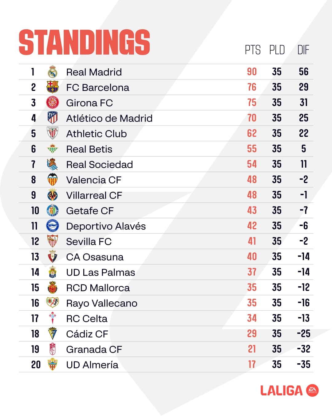 1. เรอัล มาดริด แข่ง 35 นัด มี 90 แต้ม *แชมป์