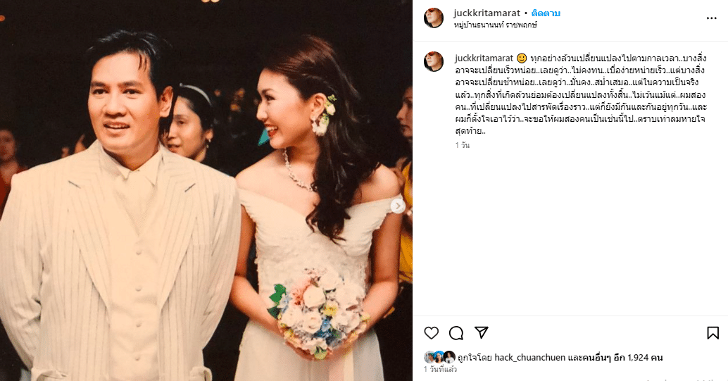 ล่าสุด 13 พ.ค. 67 นักแสดงรุ่นใหญ่ก็สาดความหวานให้หอมกรุนไปทั่วทั้งโซเชียล หลังโพสต์ข้อความพรั่งพรูความในใจถึงภรรยาและชีวิตคู่ รวมถึงย้อนภาพบรรยากาศในวันแต่งงาน ลั่นประโยคซึ้ง ‘ทุกอย่างล้วนเปลี่ยนแปลงไปตามกาลเวลา แต่ก็ยังมีกันและกันอยู่ทุกวัน และจะเป็นเช่นนี้ตราบลมหายใจสุดท้าย’