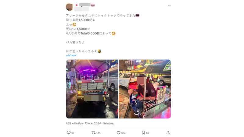 โลกออนไลน์เดือด คืบหน้ากรณี นักท่องเที่ยวชาวญี่ปุ่น 4 คน เจอประสบการณ์สุดเซ็ง โดนคนขับรถตุ๊กตุ๊กเรียกเก็บค่าโดยสารสูงถึง 6,000 บาท หลังใช้บริการจากสุขุมวิท ซอย 18 ไปยังห้างธนิยะ พลาซ่า (สีลม) ระยะทางไม่เกิน 6 กิโลเมตร เมื่อช่วงค่ำวันที่ 13 พฤษภาคมที่ผ่านมา จนต้องมาแชร์ประสบภัยผ่านทวิตเตอร์