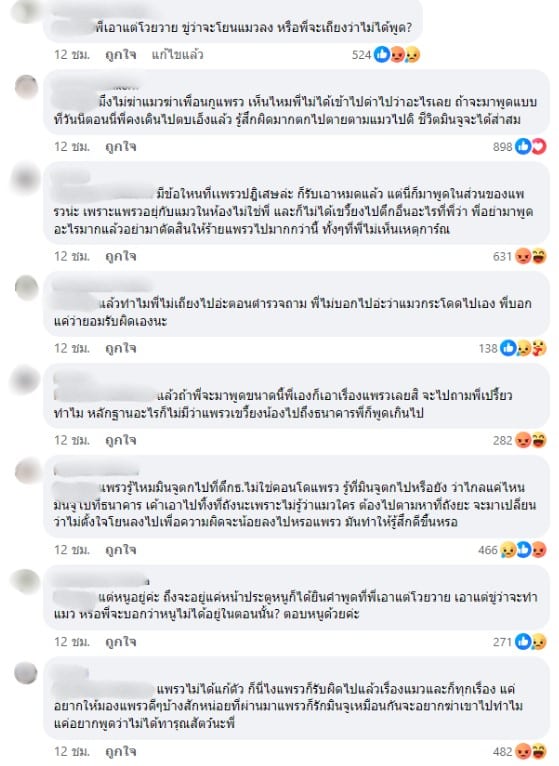“ตอนนี้สงสารทั้งแมว สงสารทั้งคน เอาเป็นว่า ถ้ามีหลักฐานมาจริงๆ โลกจะเข้าใจ เพราะถ้าแมวกระโดดเพราะตกใจพี่ก็เชื่อ ขอกล้องคอนโด เพื่อสังคมจะเข้าใจ ไม่ซ้ำเติม เข้าใจทั้ง 2 ฝ่าย แต่ก็ให้โอกาสอธิบายบ้าง แต่ถ้าไม่มีหลักฐาน สังคมก็จะไม่เชื่อ”