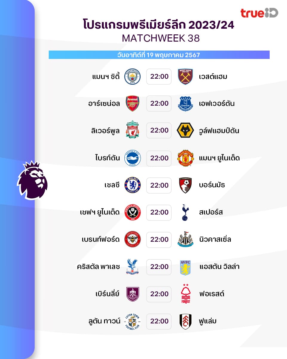 โปรแกรมพรีเมียร์ลีก 2023/24 สัปดาห์ที่ 38 แข่งวันที่ 19 พ.ค. เช็คตารางแข่งพร้อมช่องดูบอลสด