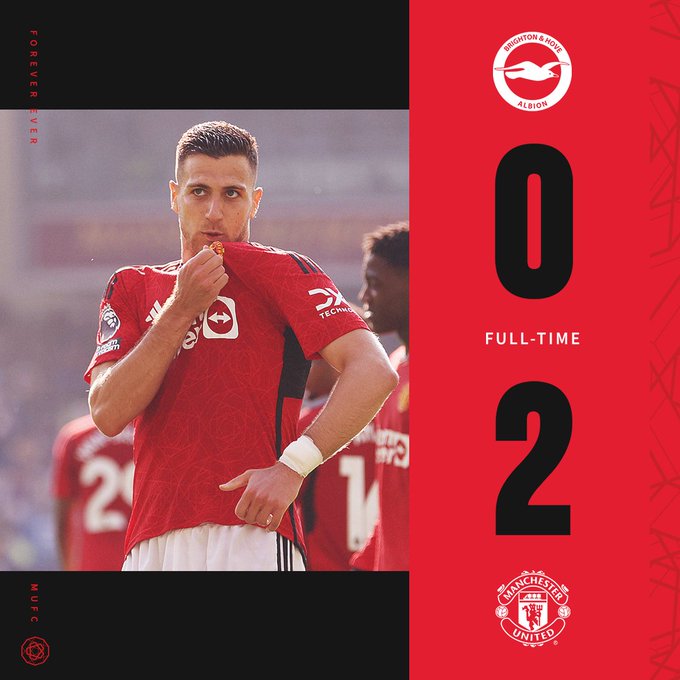 ผลการแข่งขันปรากฏว่า แมนยู แม้ส่งตัวหลักลงต้นเหม แต่ยังเล่นไร้ทรงโดนเจ้าบ้านไบรท์ตันที่ต้องการส่งท้ายกุนซือ เด แซร์บี้ กระหน่ำยิง แต่จบไม่คม สุดท้ายโดน ‘ปีศาจแดง’ อาศัยควาเฉียบขาดได้ประตูจาก ดีโอโก้ ดาโลต์ และ ราสมุส ฮอยลุนด์ ช่วยกันซัดคนละตุงพาผีแดงบุกชนะ 2-0 แม้เก็บ 3 แต้ม แต่ผลคู่อื่นๆไม่เป็นใจจบที่ 8 ในลีก และต้องไปลุ้นตั๋วยุโรปในเกมนัดชิงฯ เอฟเอ คัพ กับแมนฯ ซิตี้ ในสัปดาห์หน้า