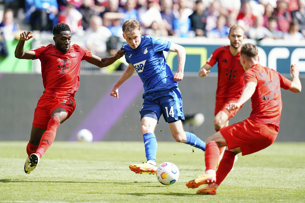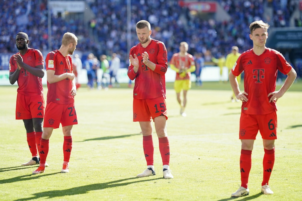 Hoffenheim’s team celebrates scoring their fourth goal, during the German Bundesliga soccer match between TSG 1899 Hoffenheim and Bayern Munich, in Sinsheim, Germany, Saturday, May 18, 2024. (Uwe Anspach/dpa via AP)From left, Munich’s Dayot Upamecano, Konrad Laimer, Erik Dier and Joshua Kimmich stand in front of the fan curve after the German Bundesliga soccer match between TSG 1899 Hoffenheim and Bayern Munich, in Sinsheim, Germany, Saturday, May 18, 2024. (Uwe Anspach/dpa via AP)Munich’s Alphonso Davies, left and Hoffenheim’s Maximilian Beier vie for the ball, during the German Bundesliga soccer match between TSG 1899 Hoffenheim and Bayern Munich, in Sinsheim, Germany, Saturday, May 18, 2024. (Uwe Anspach/dpa via AP)Munich’s Aleksandar Pavlovic, left, and Hoffenheim’s Andrej Kramaric fight for the ball during the Bundesliga soccer match between TSG1899 Hoffenheim and Bayern Munich, at the PreZero Arena in Sinsheim, Germany, Saturday May 18, 2024. (Uwe Anspach/dpa via AP)Munich coach Thomas Tuchel arrives at the stadium, ahead of the German Bundesliga soccer match between TSG 1899 Hoffenheim and Bayern Munich, in Sinsheim, Germany, Saturday, May 18, 2024. (Uwe Anspach/dpa via AP)