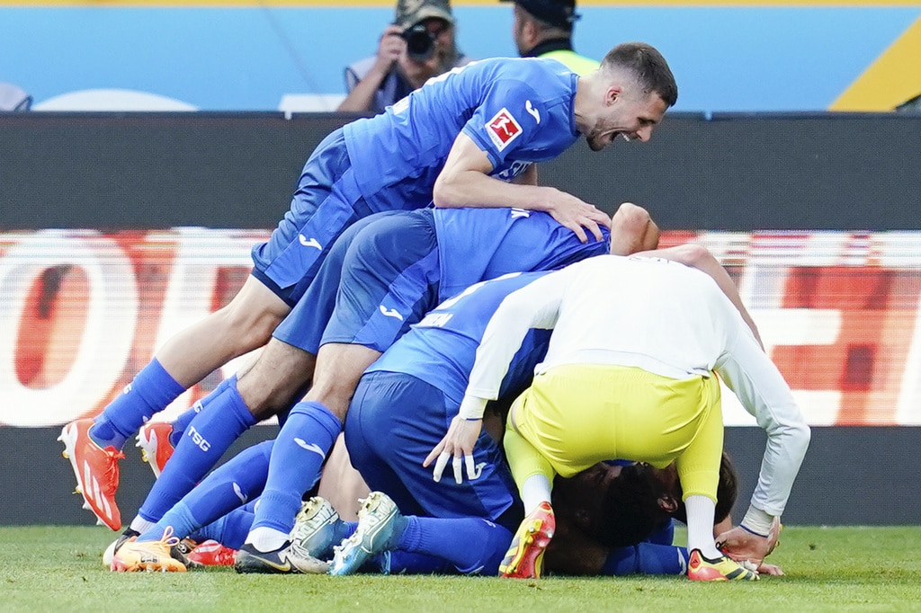Hoffenheim’s goalscorer Andrej Kramaric, right, celebrates with teammates after scoring a goal, during the German Bundesliga soccer match between TSG 1899 Hoffenheim and Bayern Munich, in Sinsheim, Germany, Saturday, May 18, 2024. (Uwe Anspach/dpa via AP)