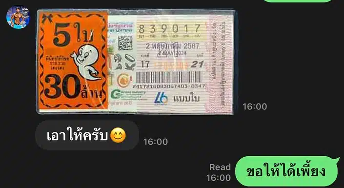 นอกจากนั้นก็ยังมีภาพแชทเหตุการณ์ตอนที่พ่อก็อตถ่ายภาพลอตเตอรี่ชุด 4 ใบที่ปรากฏเลขท้ายสองตัว 6 – 0 ส่งมาให้ภรรยา พร้อมบอกว่า “ซื้อให้ครับ” ซึ่งทางแม่บุ๋มก็ตอบกลับไปว่า “ร้ากกกก”