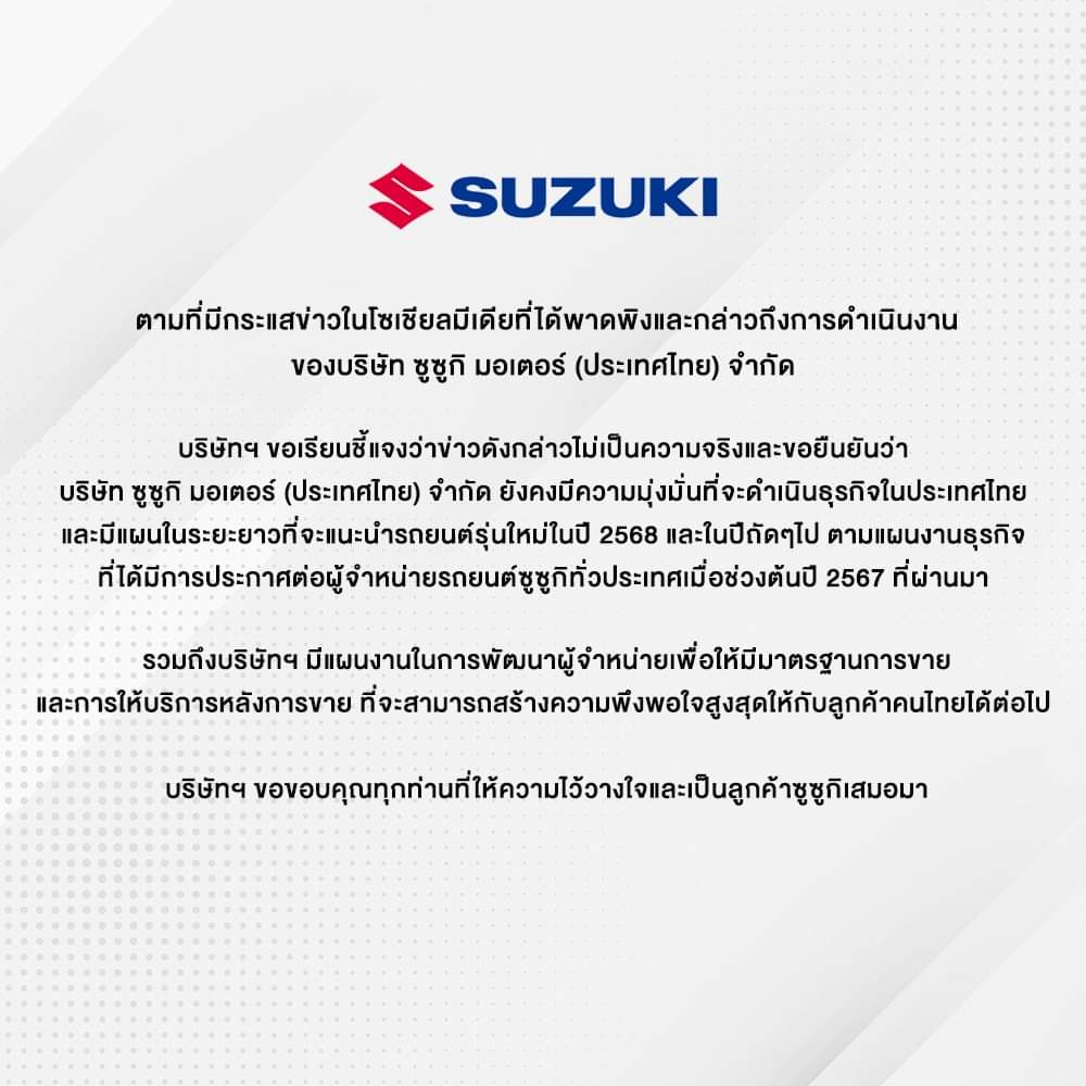 บริษัทฯ ขอเรียนชี้แจงว่าข่าวดังกล่าวไม่เป็นความจริงและขอยืนยันว่า บริษัท ซูซูกิ มอเตอร์ (ประเทศไทย) จำกัด ยังคงมีความมุ่งมั่นที่จะดำเนินธุรกิจในประเทศไทย และมีแผนในระยะยาวที่จะแนะนำรถยนต์รุ่นใหม่ในปี 2568 และในปีถัดๆไป ตามแผนงานธุรกิจที่ได้มีการประกาศต่อผู้จำหน่ายรถยนต์ซูซูกิทั่วประเทศเมื่อช่วงต้นปี 2567 ที่ผ่านมา