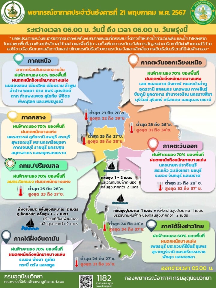 กรมอุตุนิยมวิทยา พยากรณ์อากาศประจำวัน 21 พฤษภาคม 2567
