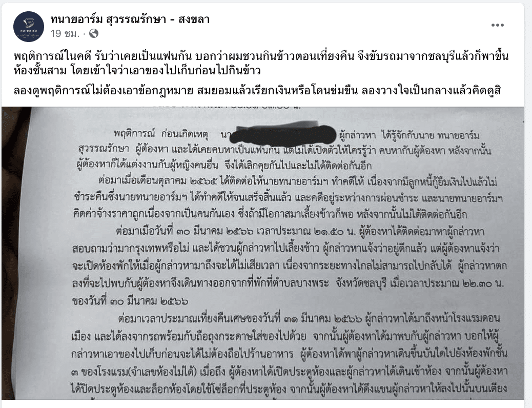 “เมื่อเดือนต.ค 2565 ผู้หญิงคนหนึ่ง ซึ่งเคยคบหากับผม มาขอให้ทำคดีให้ ค่าใช้จ่ายประมาณ 30,000 ผมก็ทำให้โดยไม่ได้รับเงิน พบคดีจบก็ไม่เจอกันอีกเลย