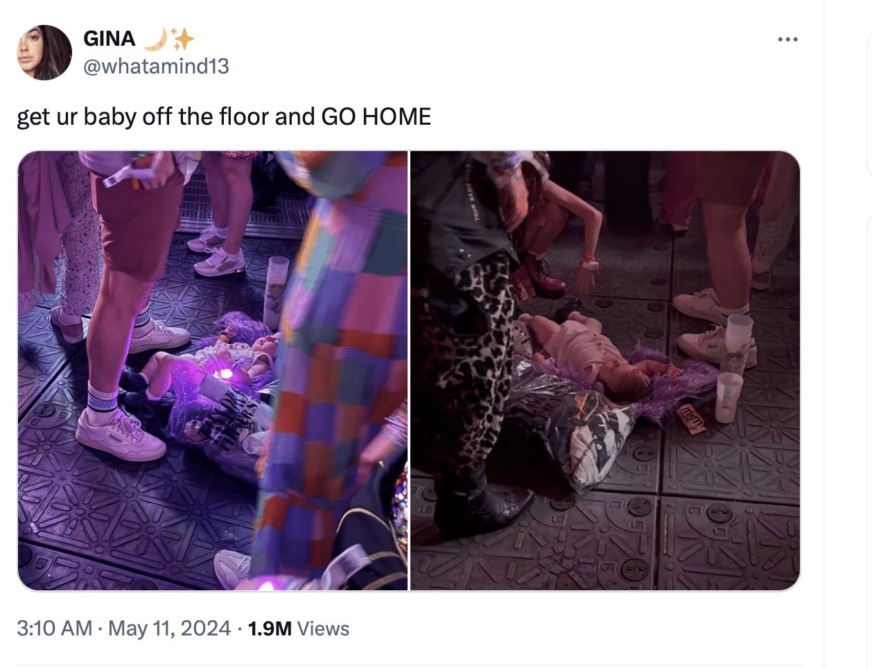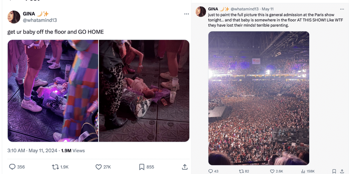 ผู้ใช้ทวิตเตอร์ชื่อ GINA ได้โพสต์ภาพดังกล่าว พร้อมข้อความแสดงความไม่พอใจและห่วงใยในความปลอดภัยของเด็กทารก โดยระบุว่า “just to paint the full picture this is general admission at the Paris show tonight… and that baby is somewhere in the floor AT THIS SHOW! Like WTF they have lost their minds! terrible parenting.”