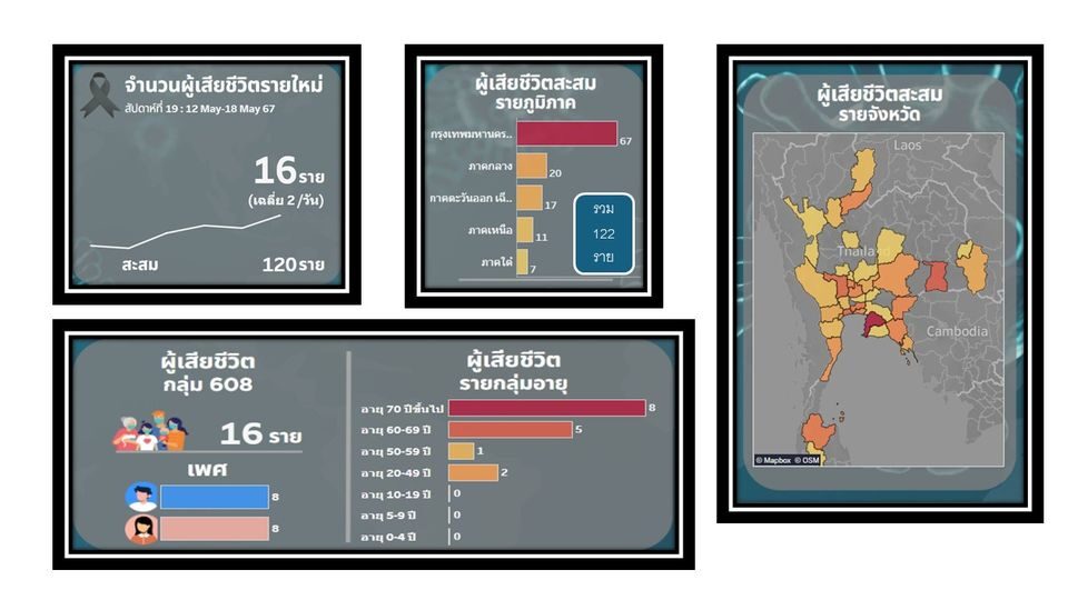 วันนี้ (21 พ.ค. 67) นพ.ธีระ วรธนารัตน์ คณะแพทยศาสตร์ จุฬาลงกรณ์มหาวิทยาลัย เปิดเผยข้อมูลน่าตกใจผ่านเฟซบุ๊กส่วนตัว ระบุว่าในสัปดาห์ที่ผ่านมาเพียงสัปดาห์เดียว มีผู้เสียชีวิตจากโควิด-19 ในประเทศไทยสูงถึง 120 ราย โดยกรุงเทพมหานครเป็นพื้นที่ที่มีผู้เสียชีวิตมากที่สุดถึง 67 ราย ตามมาด้วยภาคกลาง 20 ราย ภาคอีสาน 17 ราย ภาคเหนือ 11 ราย และภาคใต้ 7 ราย